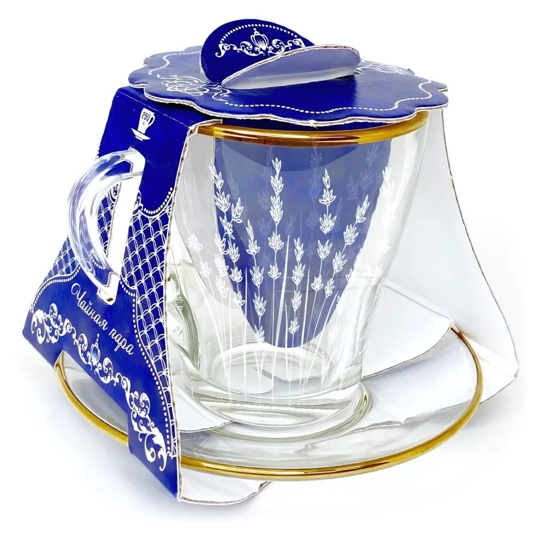 Чайная пара с изящным декором «Лаванда» создана для тех, кто ценит атмосферу уюта и эстетики в деталях. Прозрачное стекло в сочетании с белым растительным орнаментом и аккуратной золотой окантовкой придаёт сервировке изысканность и делает даже повседневное чаепитие особенным.