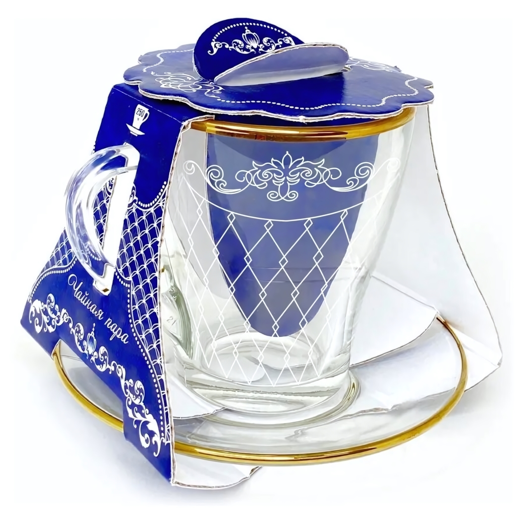 Чайная пара "Винтаж" создана для тех, кто ценит эстетичную сервировку и особое настроение за чашкой любимого напитка. Прозрачное стекло в сочетании с изящным узором и золотистой каймой придаёт подаче утончённость и делает даже повседневное чаепитие более торжественным.
