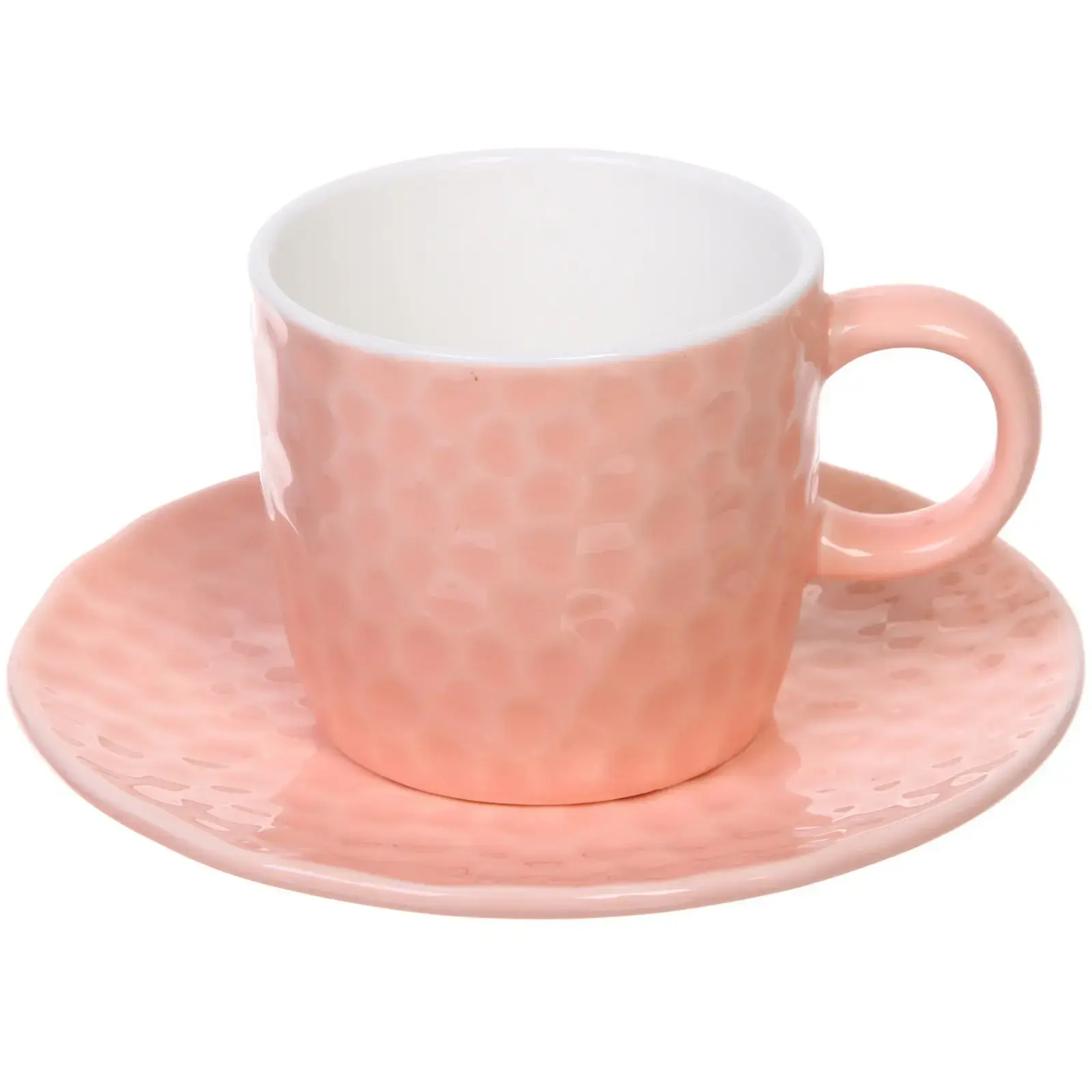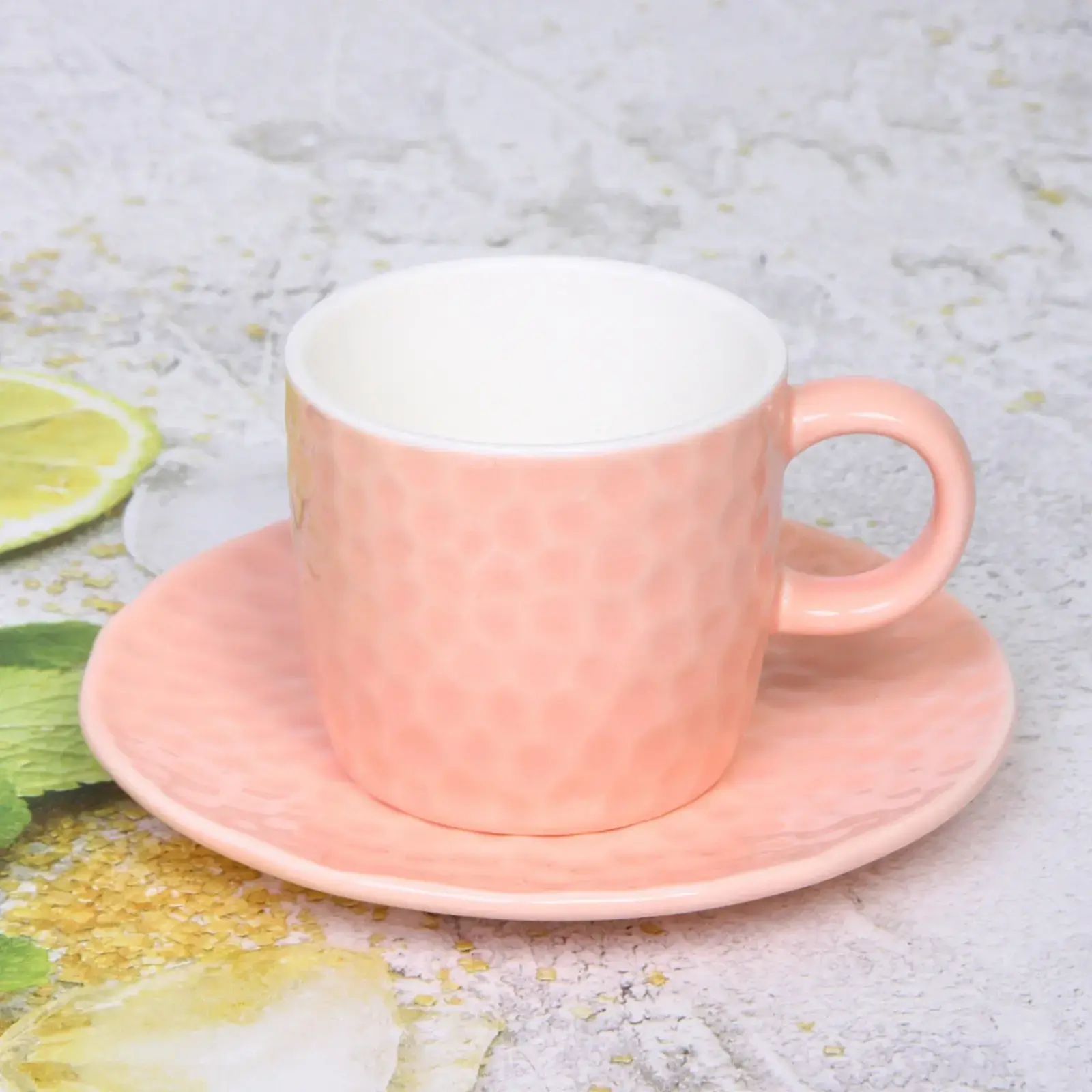Чашка имеет стандартный размер 200 мл, что делает её идеальной для порции чая или кофе. Блюдце выполнено в том же коралловом цвете и имеет аналогичную текстуру, что создает гармоничный комплект. Эта пара станет отличным дополнением к вашей кухонной посуде и подчеркнет ваш вкус.