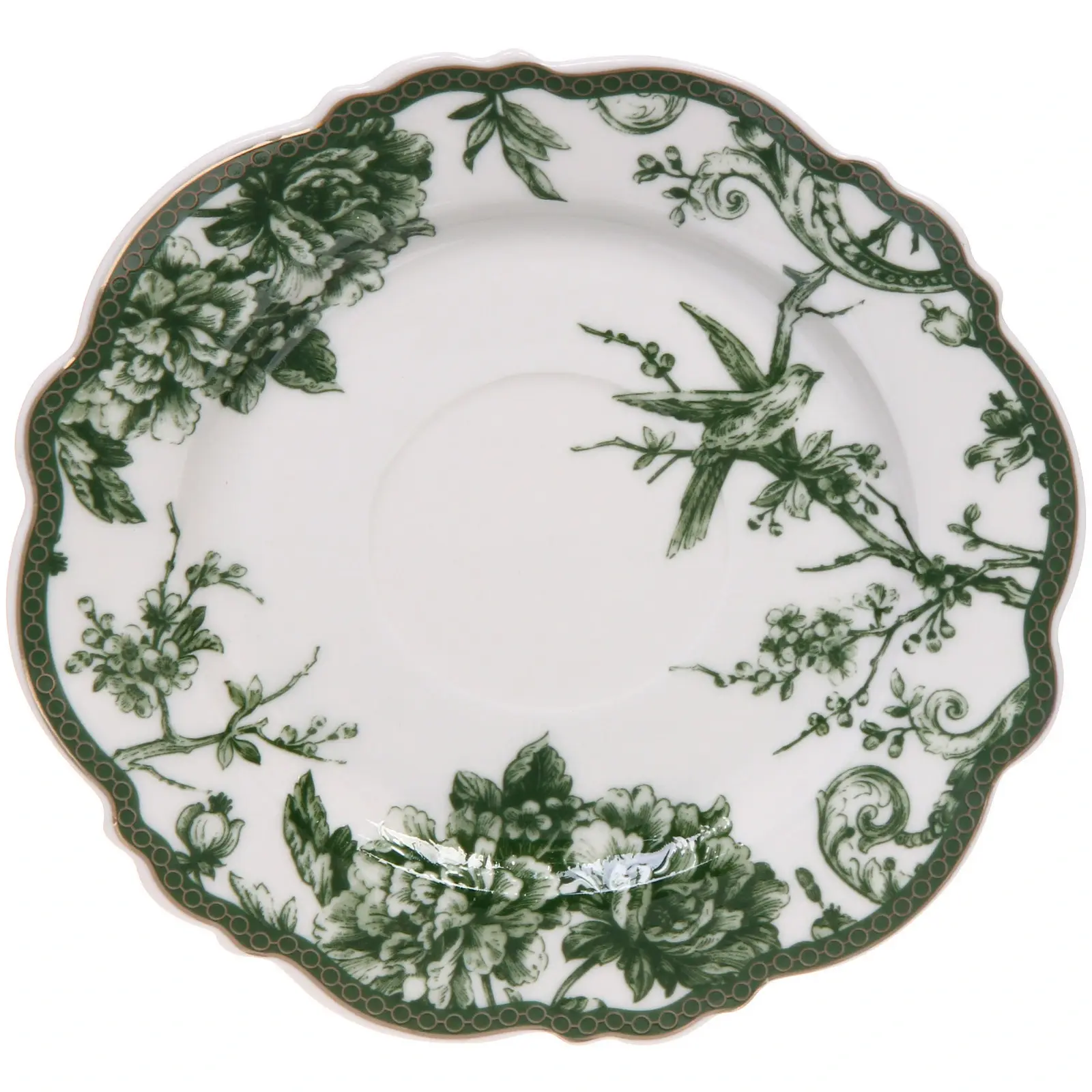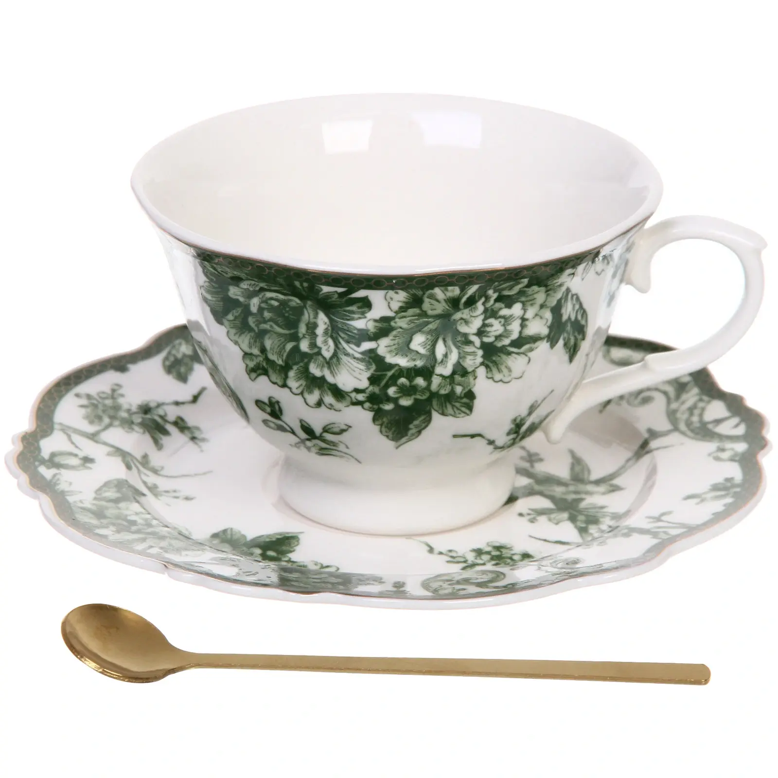 Эта чайная пара из качественной керамики сочетается с классическим дизайном и утонченностью. Она идеально подходит для уютных домашних чаепитий или в качестве подарка. В комплект входит кружка объемом 250 мл, украшенная зелёным цветочным узором, а также блюдце и металлическая ложка с золотистым акцентом, создающими ощущение красоты и тепла.