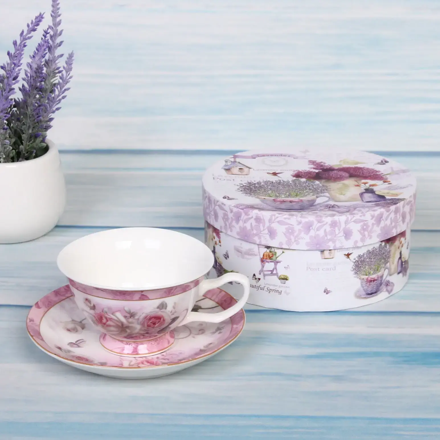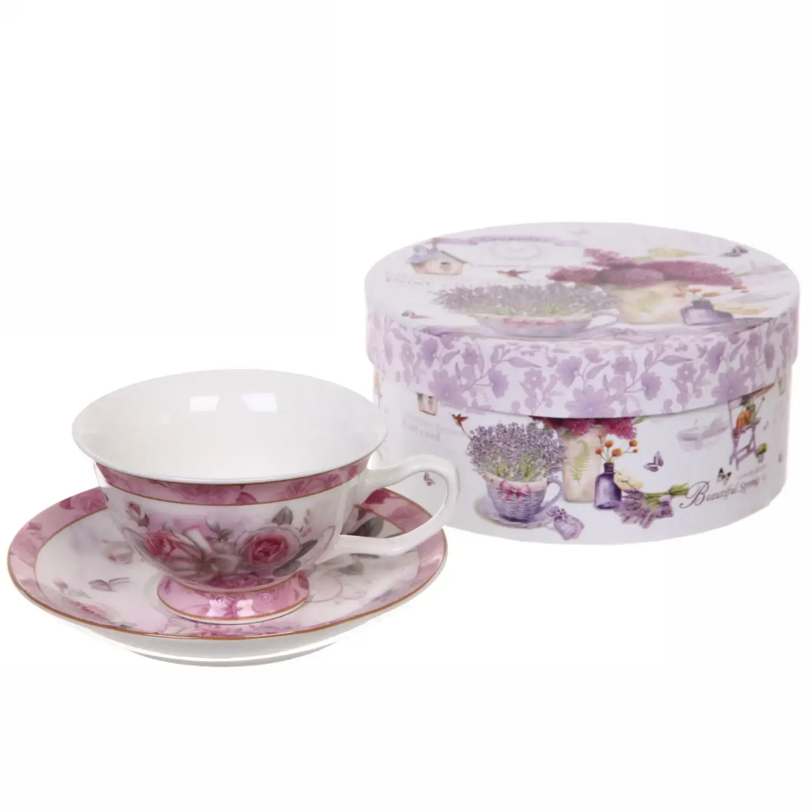 Комплект поставляется в круглой коробке с декоративными элементами, что исключает необходимость дополнительной упаковки при вручении подарка. Устойчивое блюдце предотвращает проливание жидкости, а компактные размеры позволяют хранить набор даже в небольшом шкафу.