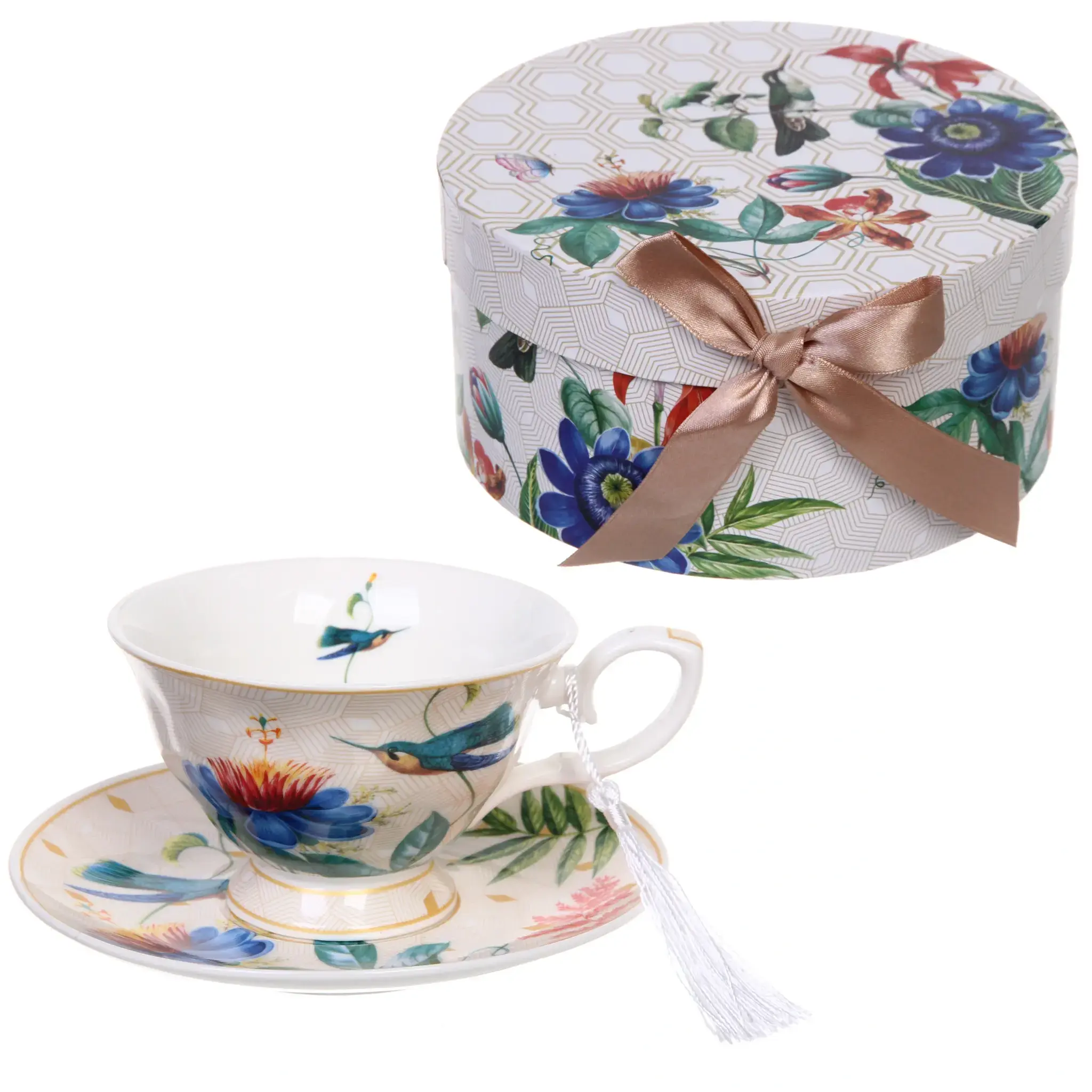 Чайная пара выполнена из высококачественной керамики, что гарантирует её долговечность и устойчивость к повреждениям. Размер кружки составляет 220 мл, что идеально подходит для порции чая или кофе. Упаковка в виде круглой коробки с ярким цветочным дизайном и бантом делает этот товар особенно привлекательным для подарка.