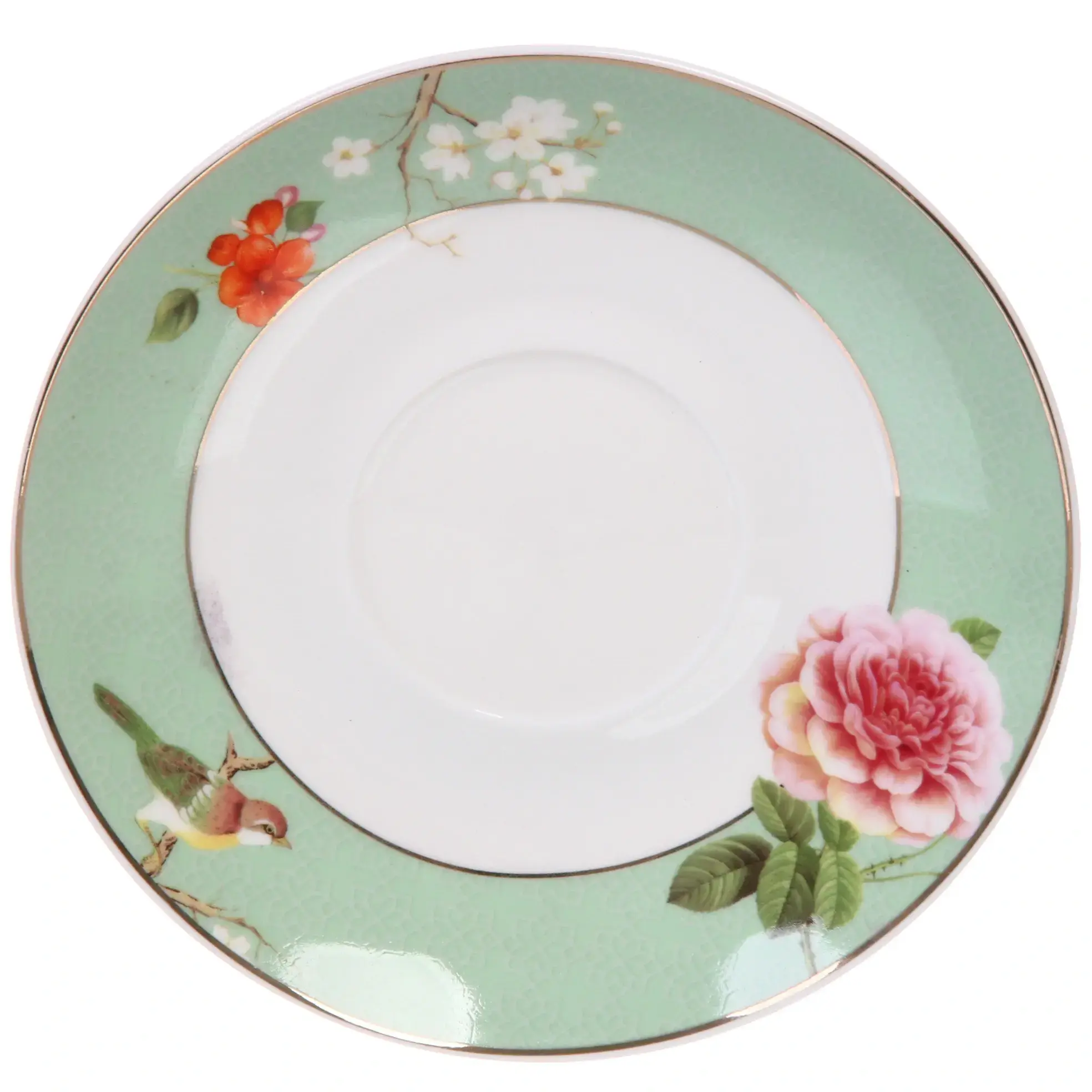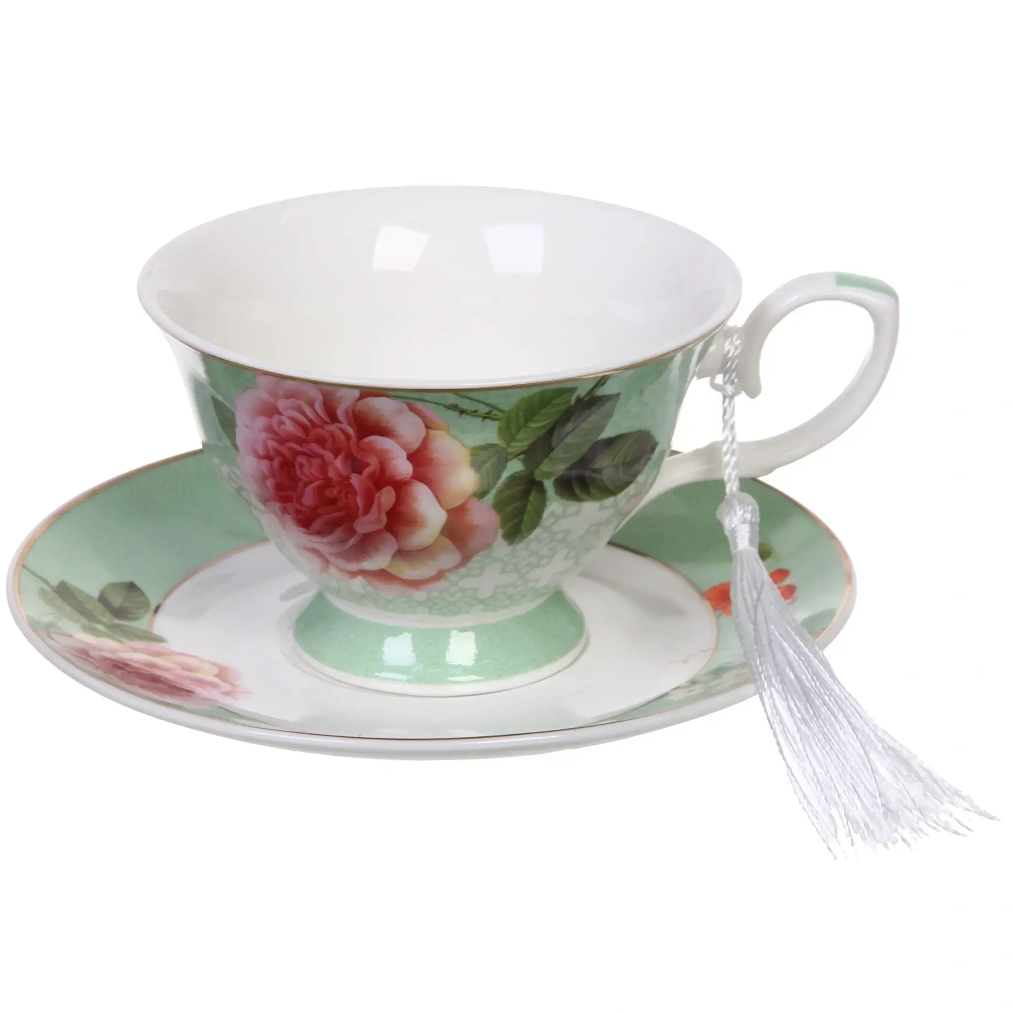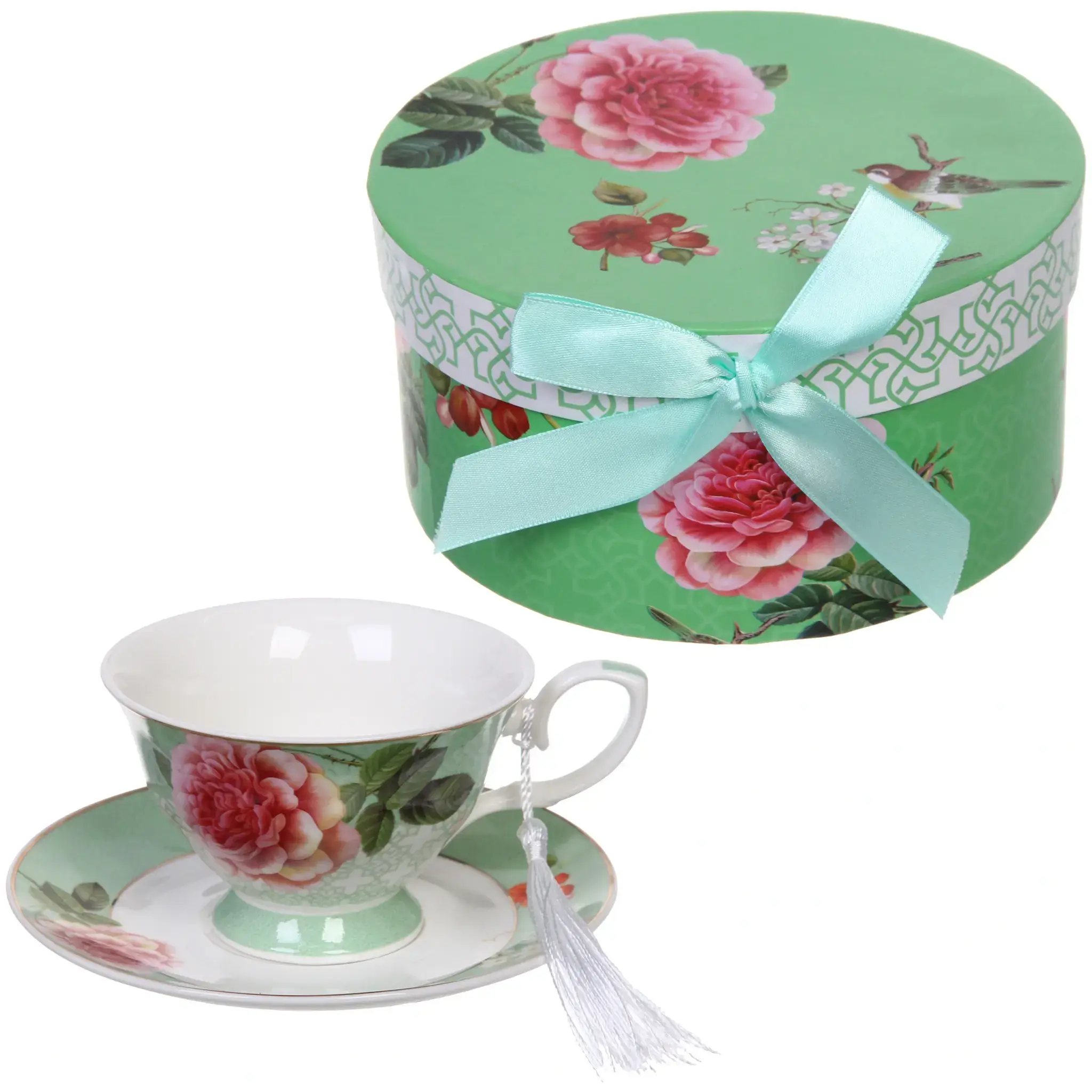 Чайная пара состоит из кружки объемом 220 мл и блюдца, выполненных из качественной керамики. Цветочная отделка и зеленый фон делают её универсальной для любого интерьера. Пара упакована в круглую подарочную коробку, украшенную голубой лентой, что добавляет ей праздничного настроения.