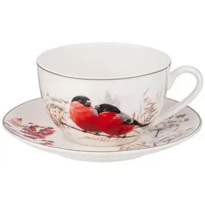 Эта нежная чайная пара объёмом 300 мл станет украшением вашего стола и подарит атмосферу зимнего уюта. Белоснежный фарфор украшен ярким зимним орнаментом со снегирями на ветках рябины, создающим праздничное настроение в любую погоду. Такой дизайн гармонично впишется как в повседневную сервировку, так и в особые случаи.