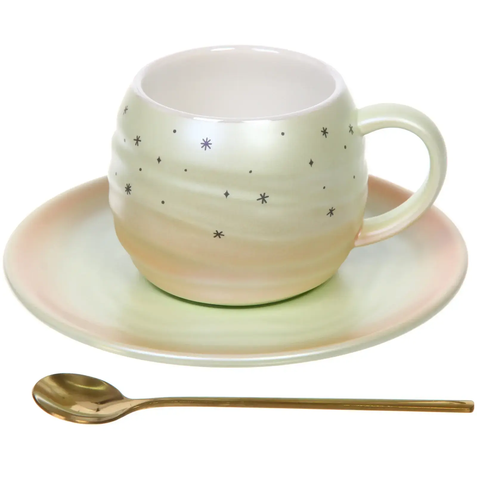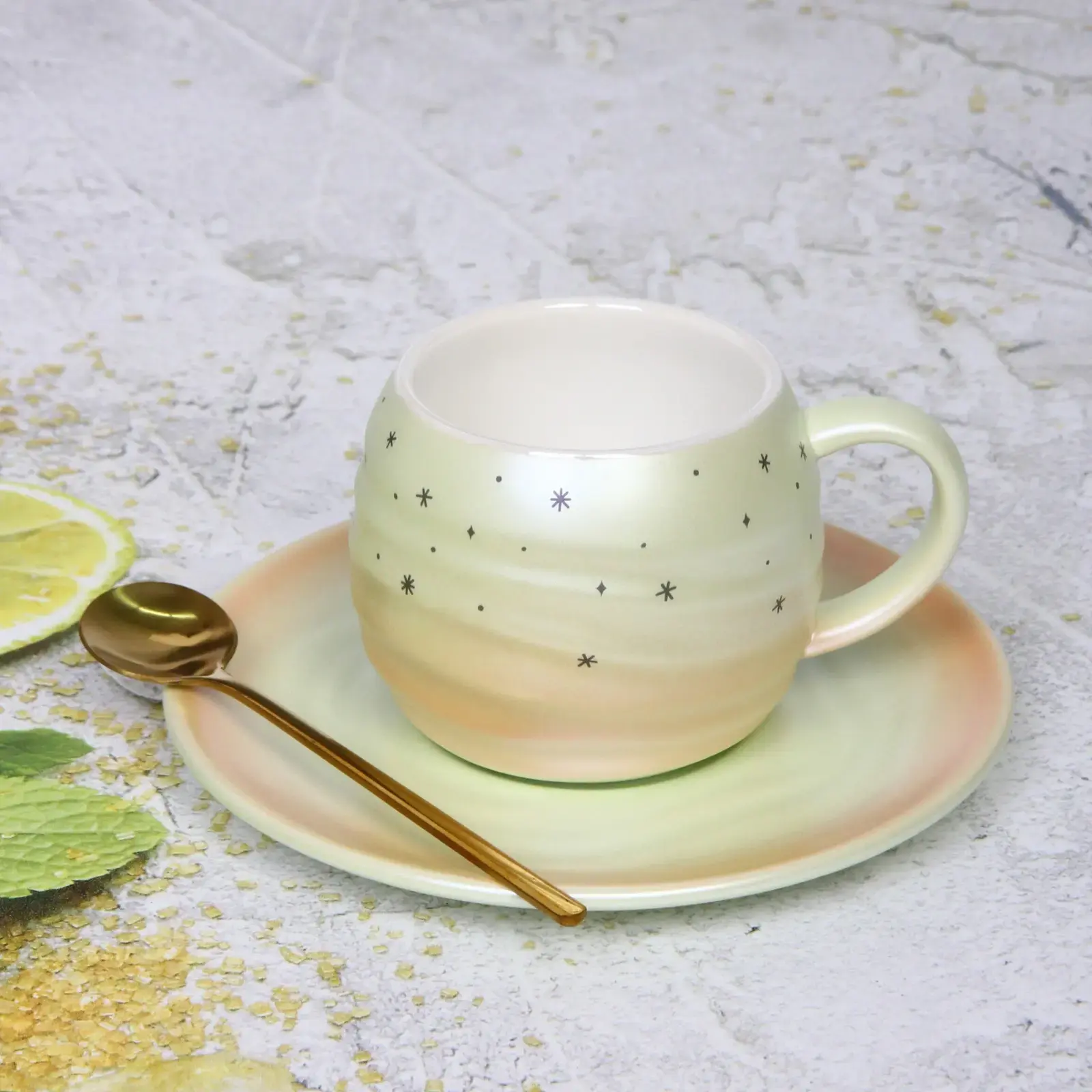 Чайная пара «Маленький космос» предназначена для любителей чая и кофе. Кружка с округлой формой удобно лежит в руке, а тонкая ручка обеспечивает комфортное использование. Блюдце служит отличной подставкой для кружки, предотвращая загрязнение стола, а ложка идеально подходит для размешивания сахара или меда.