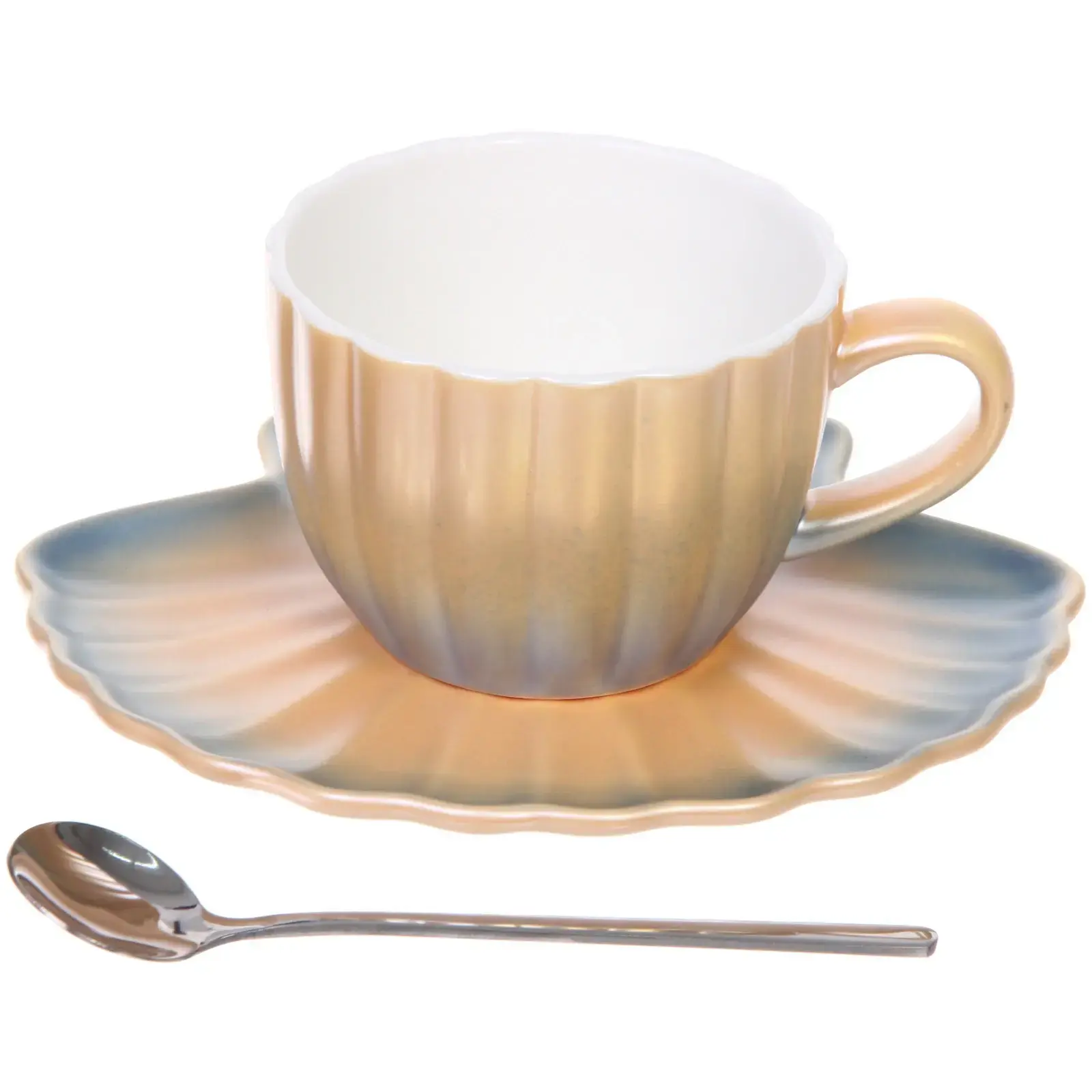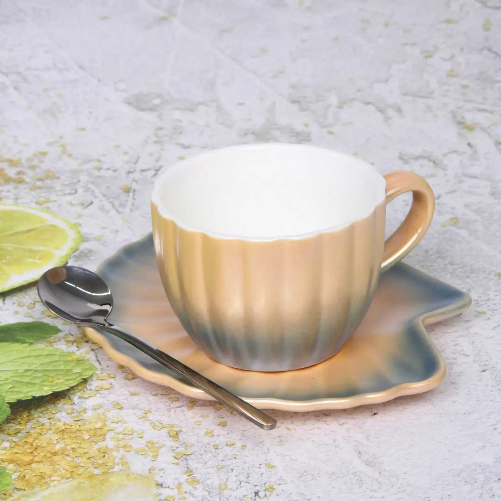 Чайная пара «Ракушка» — это идеальный выбор для тех, кто ценит стиль и качество. Эта пара, состоящая из кружки, блюдца и ложки, выполнена из высококачественной керамики и станет настоящим украшением вашего стола. Элегантный градиентный цвет оранжевого и белого оттенков придаёт ей уникальный вид, а рифлёная текстура добавляет изысканности.