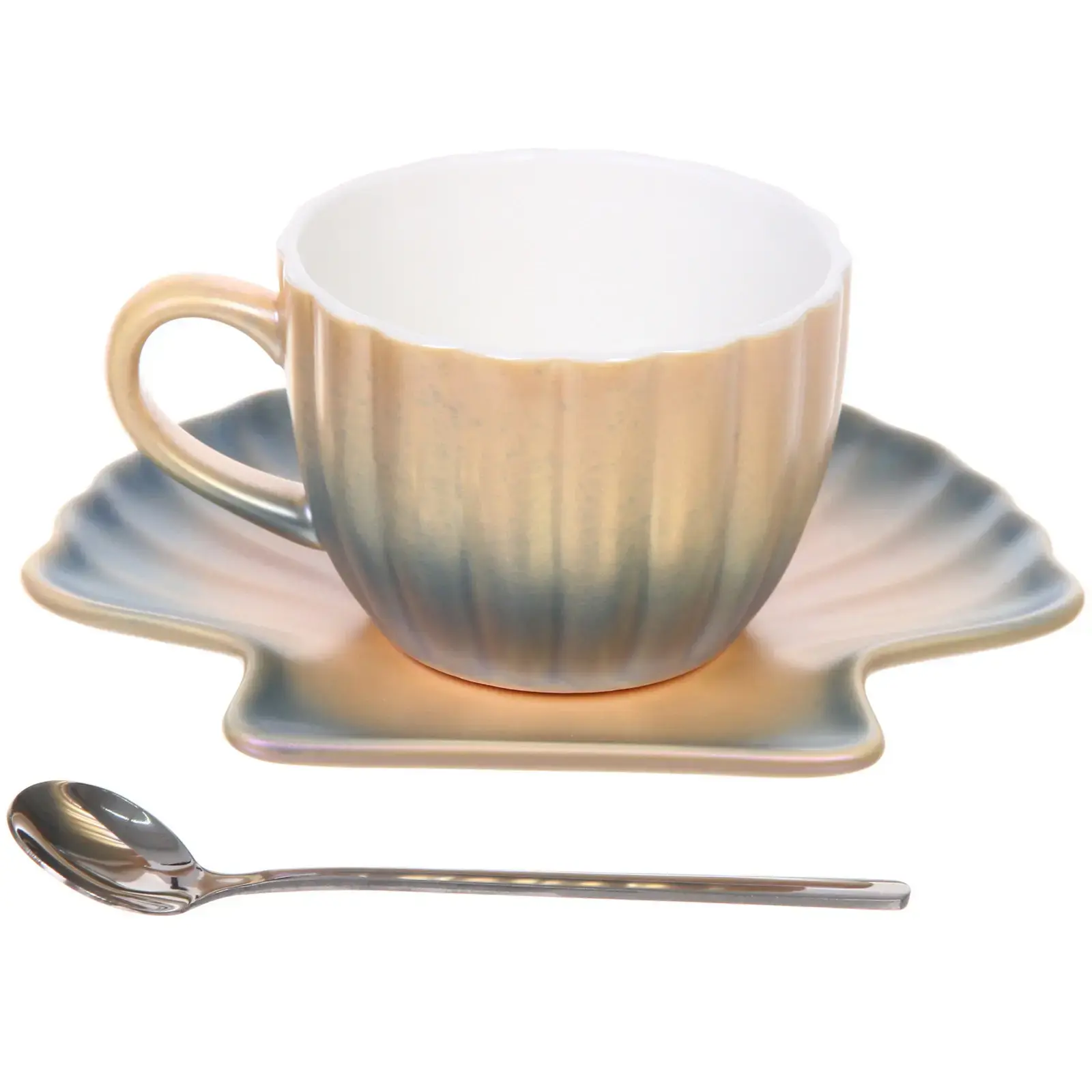 Чайная пара «Ракушка» идеально подходит для подачи чая, кофе или других напитков. Кружка объёмом 230 мл удобна для использования как дома, так и в офисе. Блюдце, выполненное в форме раковины, не только красиво, но и практично — оно защищает стол от капель и придаёт сервировке особый шарм. Ложка из металла с гладкой поверхностью завершает комплект, обеспечивая комфорт при использовании.