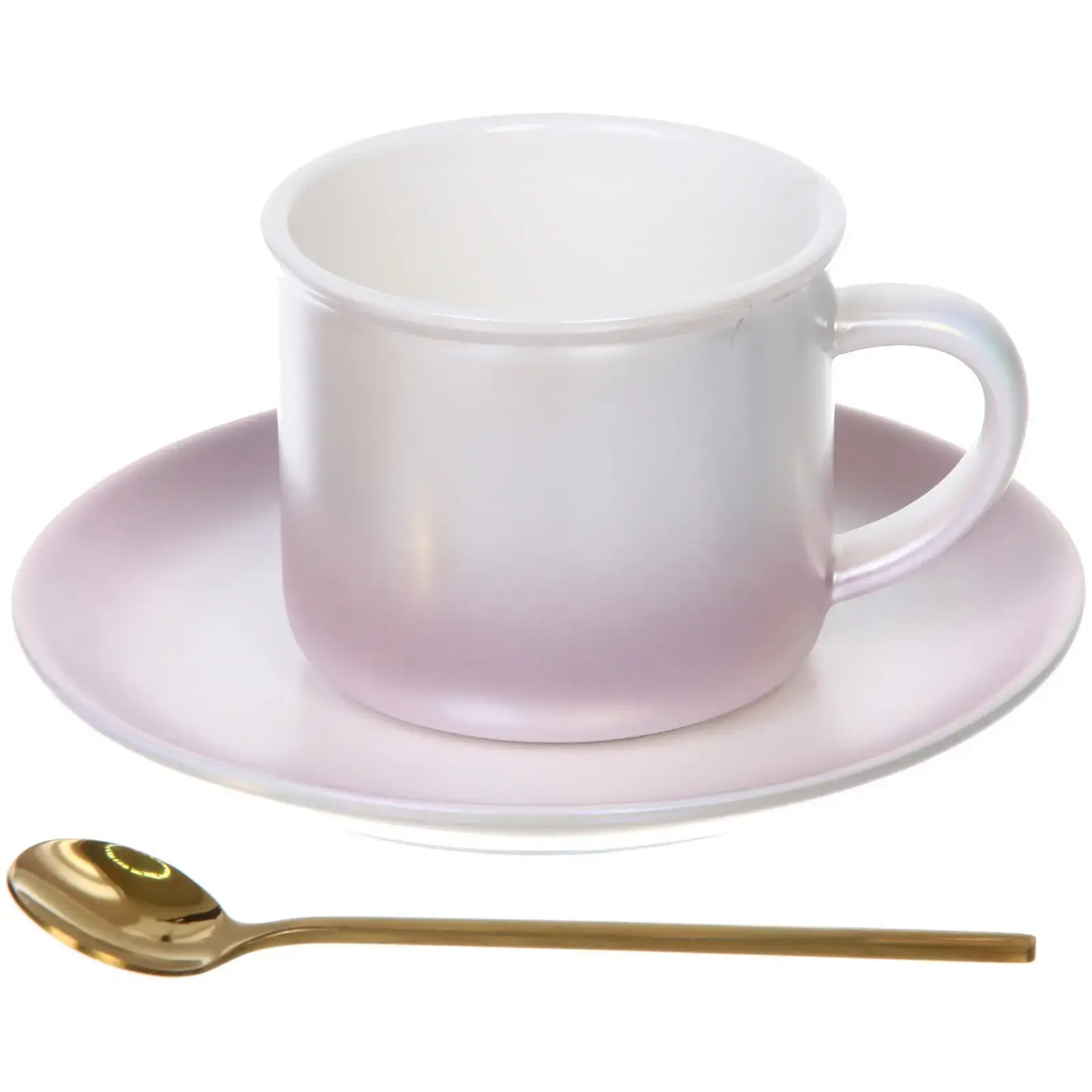 Эта изысканная чайная пара станет настоящим украшением вашего стола и подарит вам незабываемые моменты наслаждения чаем. Сочетание белого цвета с перламутровым отливом и нежно-розовыми акцентами создает атмосферу уюта и комфорта. Чайная пара включает в себя кружку объемом 230 мл, блюдце и ложку, что делает её идеальной для подачи горячих напитков.