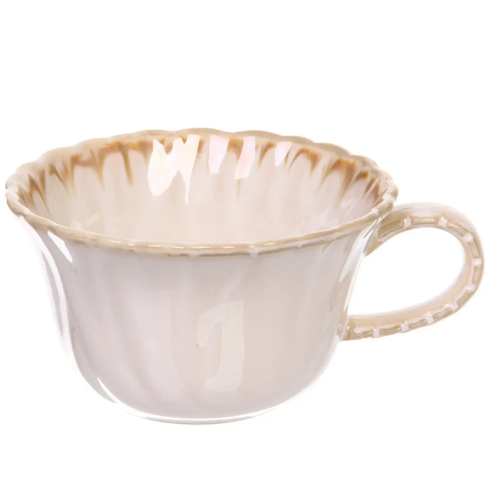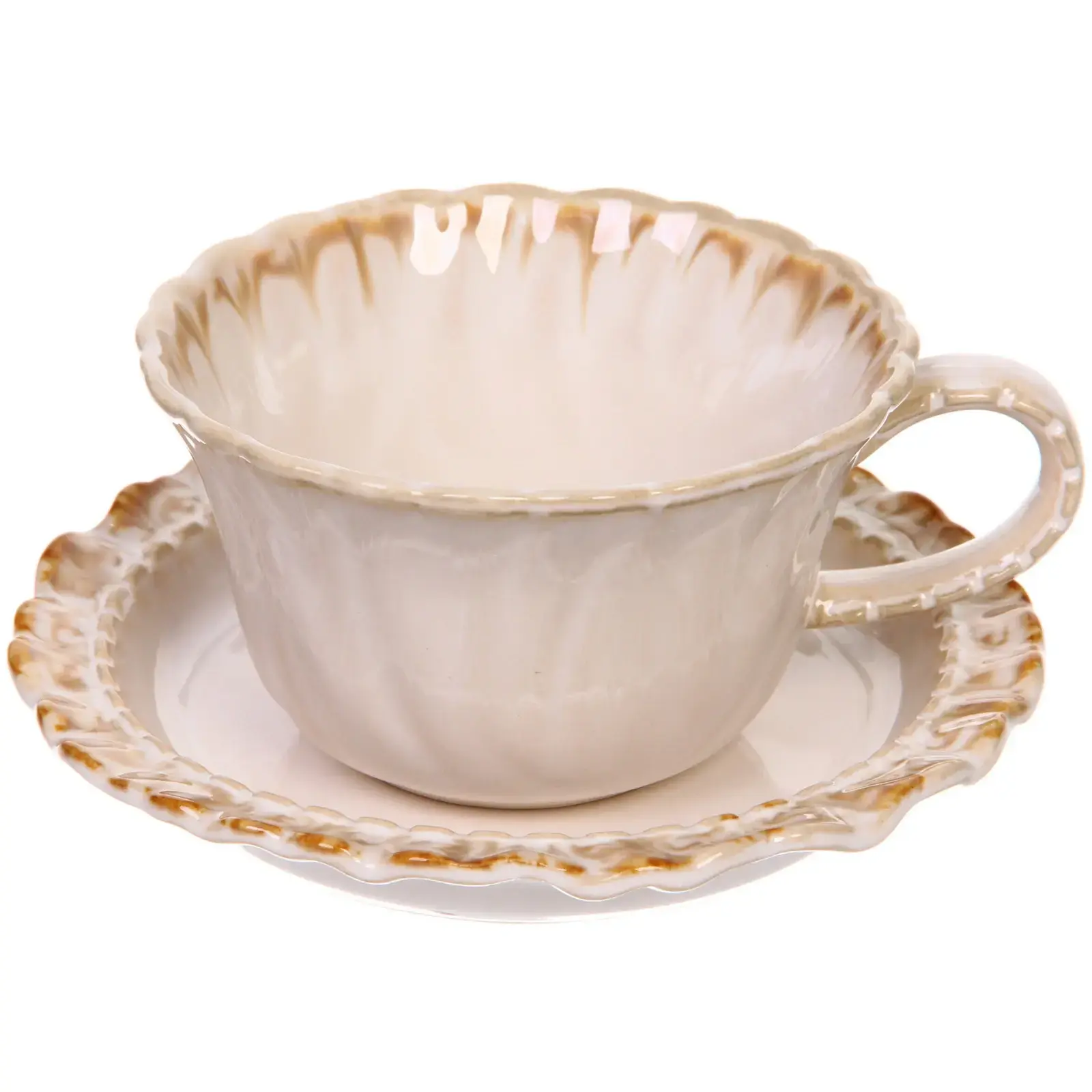 Чайная пара состоит из кружки объемом 230 мл и соответствующего блюдца, что делает её идеальной для подачи чая или кофе. Удобная ручка кружки обеспечивает комфортное использование, а рельефный край добавляет изысканности. Пара подходит для повседневного использования, а также для особых случаев, когда вы хотите порадовать гостей.