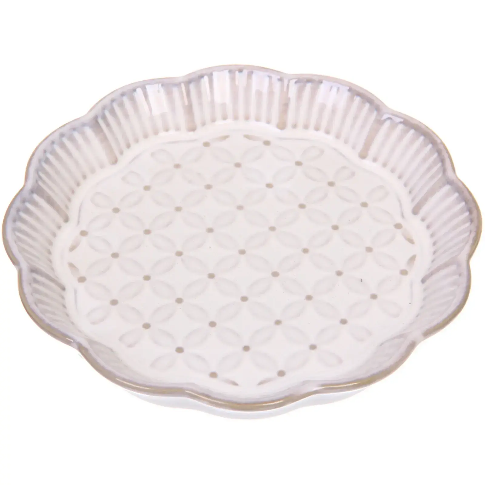 Материал: керамика; цвет: светло-бежевый с белыми узорами; комплект включает чашку и блюдце. Размер чашки — диаметр около 8-9 см, высота примерно 9 см; блюдце диаметром около 15 см.
