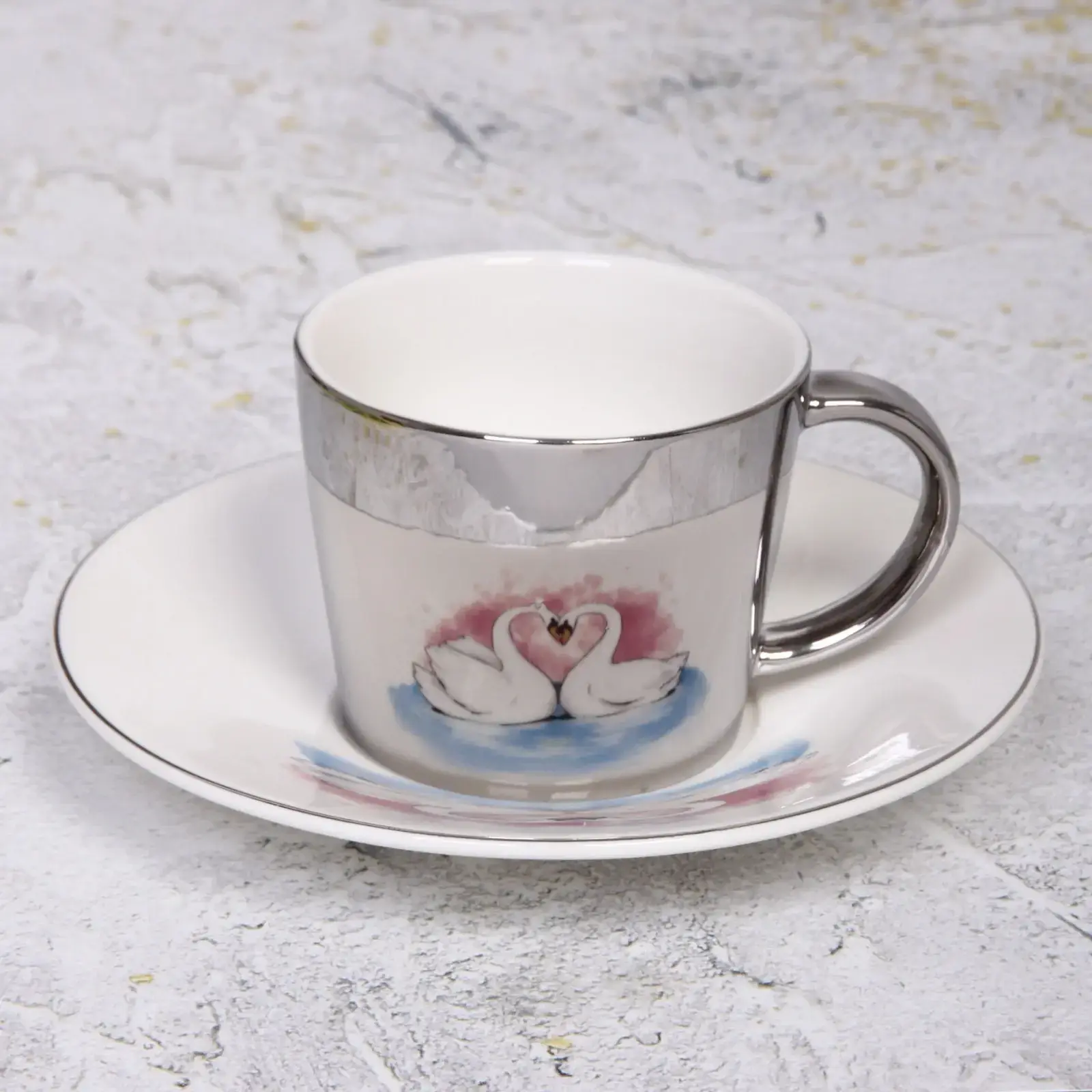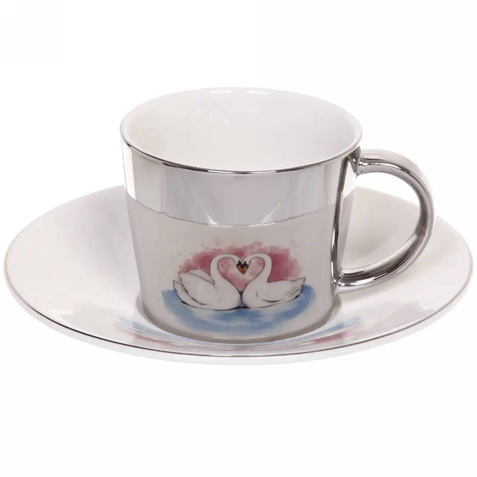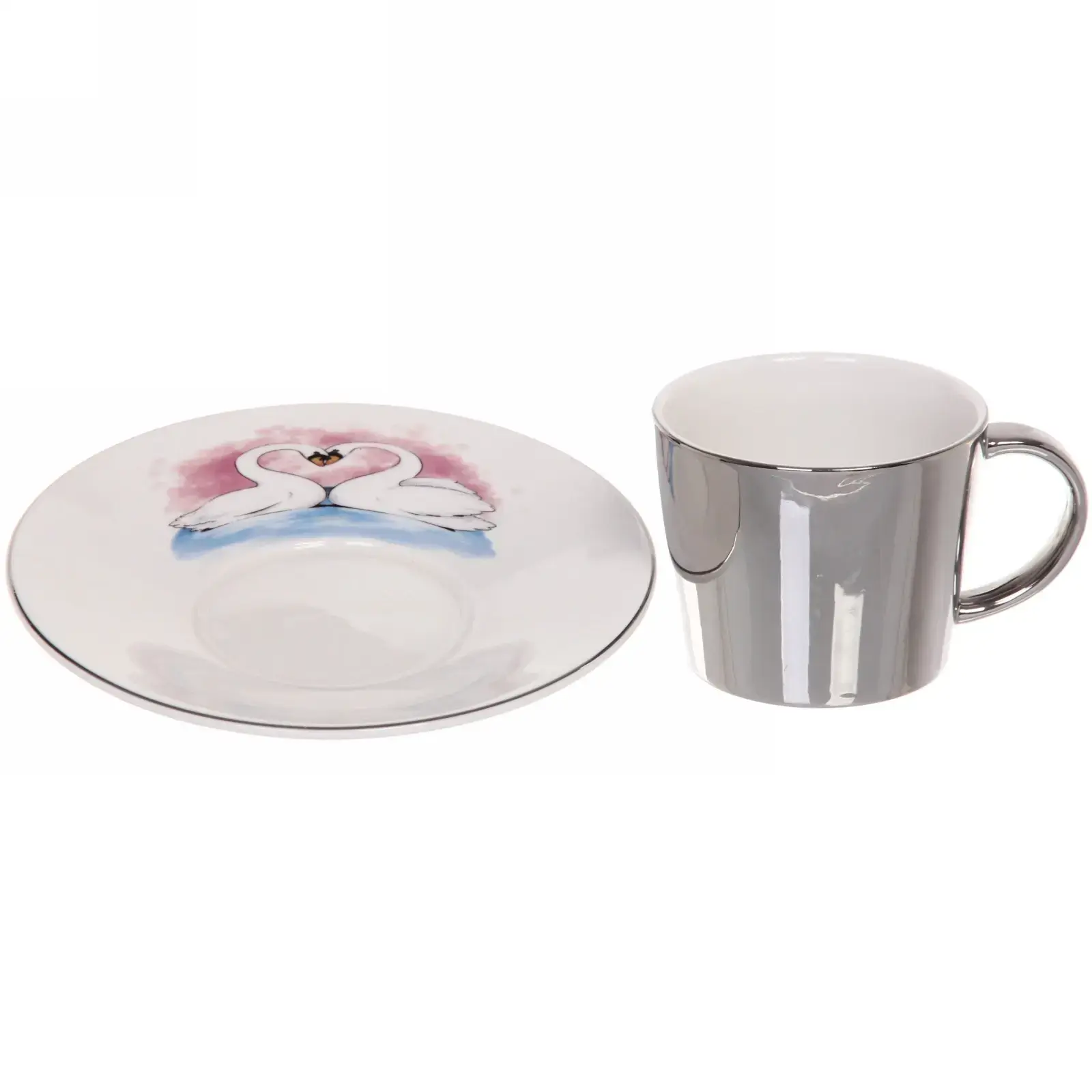 Чайная пара из керамики, 230мл, анаморфный дизайн «Лебеди», зеркальная поверхность, серебристая окантовка