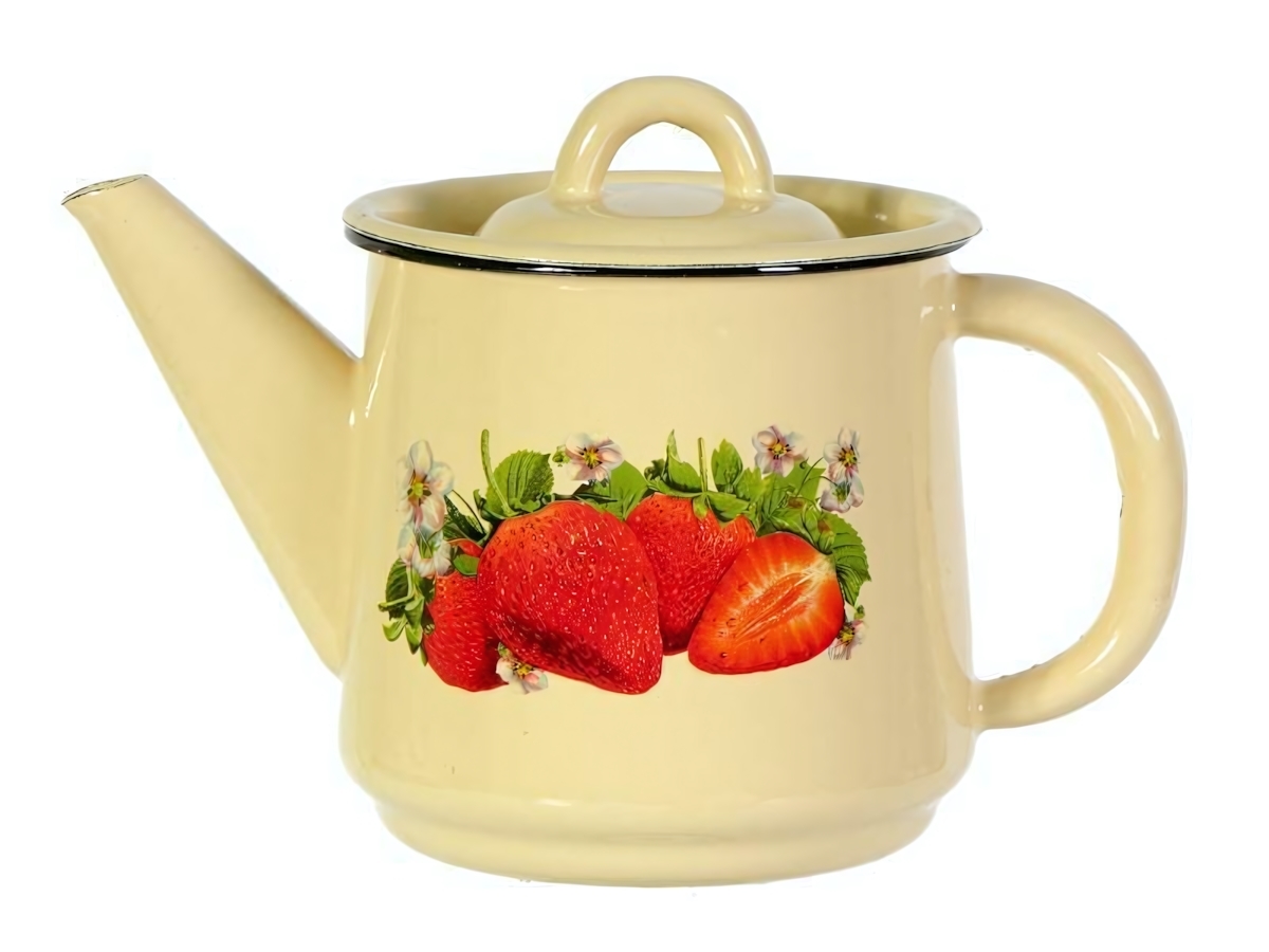 Чайник эмалированный 1л с декором «клубника», сталь, кремовый с черной окантовкой