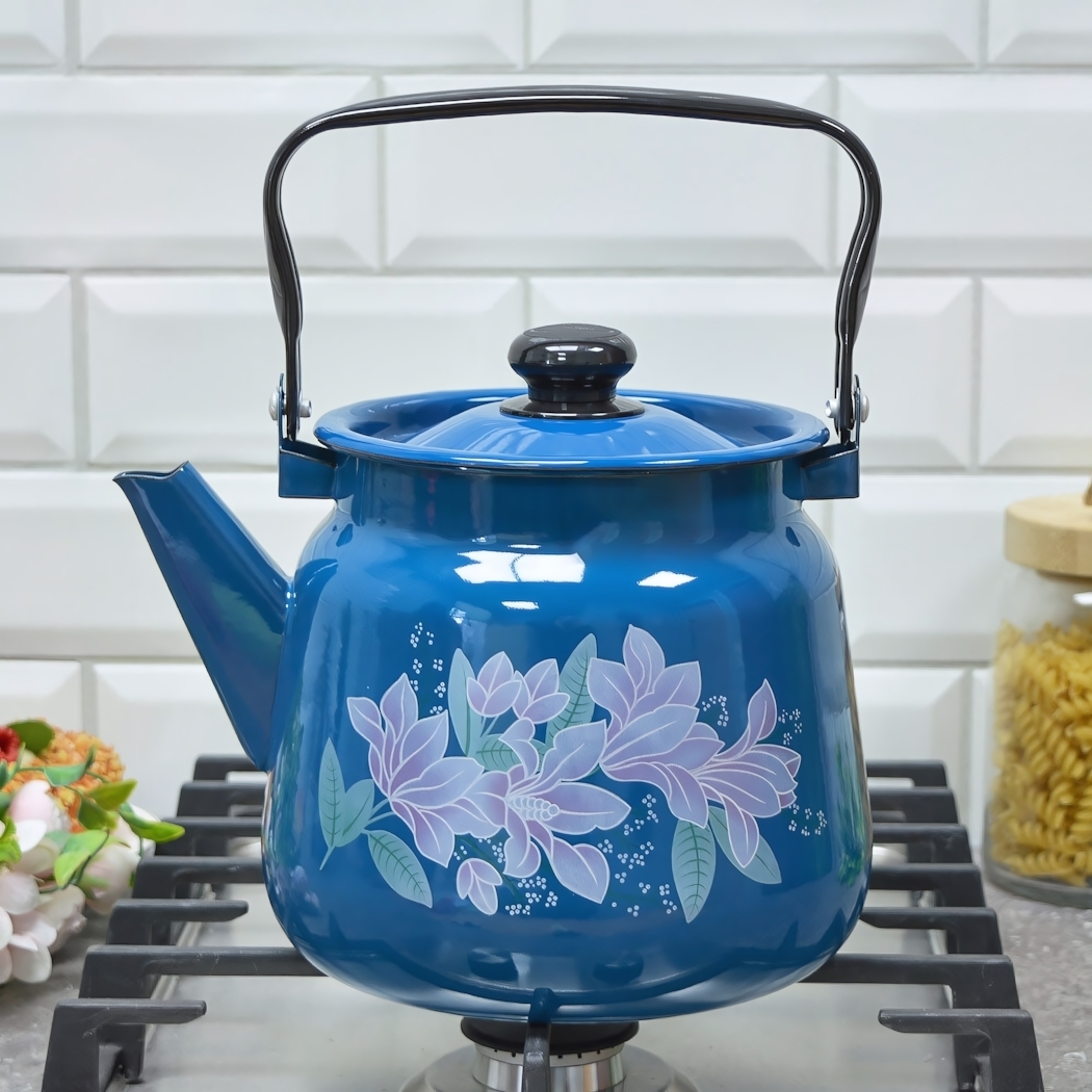 Эмалированный чайник объемом 2,3 литра сочетает в себе традиционный дизайн и современную функциональность. Его яркий кобальтовый оттенок и изящный цветочный декор добавят уюта вашей кухне, а прочная стальная конструкция гарантирует долгий срок службы.