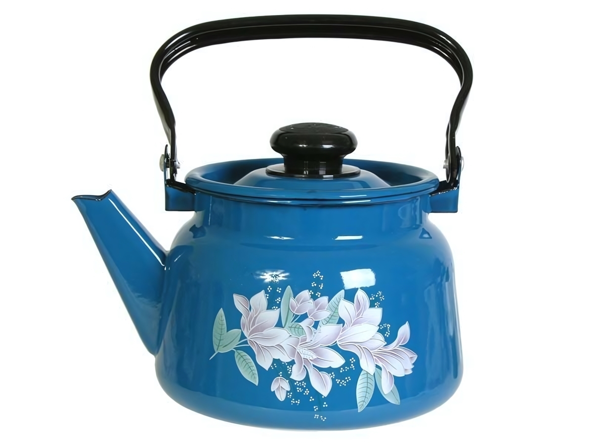 Материал корпуса — сталь. Покрытие — эмаль. Цвет — синий с рисунком васильковый. Чайник не имеет свистка. Отгружается один товар, цвет рисунка соответствует изображению.