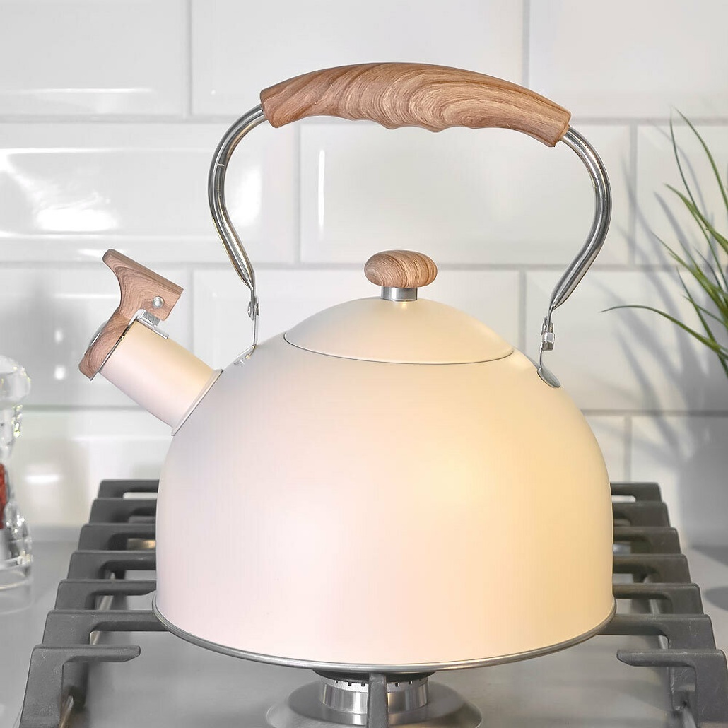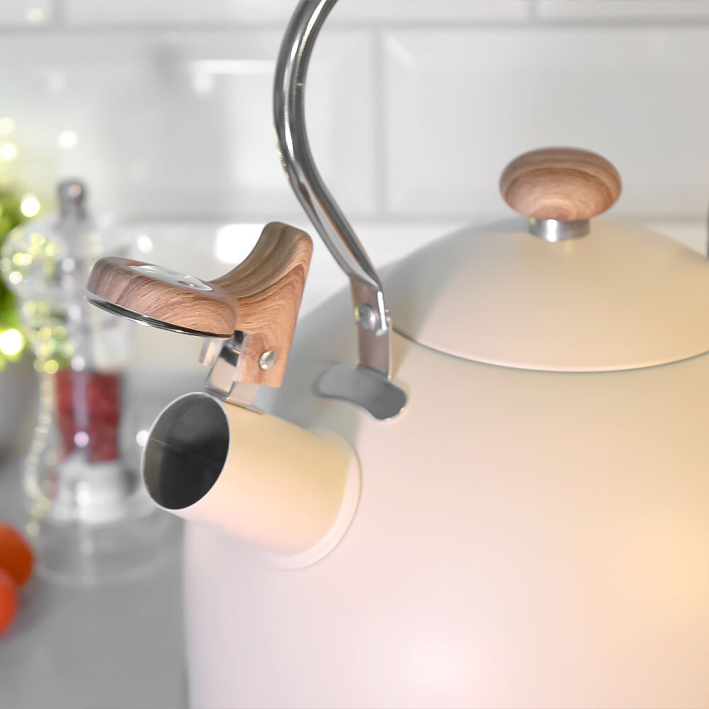 Наслаждайтесь уютом и теплом с стильным чайником объёмом 3 литра, сочетающим практичность, надёжность и привлекательный внешний вид. Светлый бежевый корпус с матовым покрытием гармонично сочетается с ручкой и деталями под дерево, создавая атмосферу домашнего тепла. Свисток на носике помогает не пропустить момент закипания, а эргономичная ручка обеспечивает удобный захват.