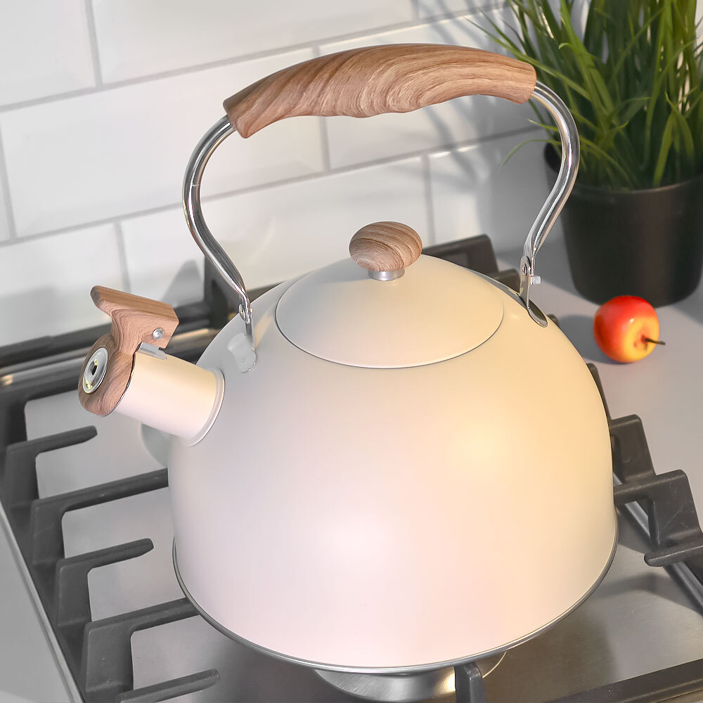 Материал корпуса — прочная сталь, устойчивая к коррозии и нагреву. Цвет бежевый, матовый, легко сочетается с современной кухонной утварью. Ручка и элементы крышки оформлены с имитацией древесной текстуры, что делает чайник не только функциональным, но и стильным. Упаковка — подарочная коробка, подходящая для дарения.