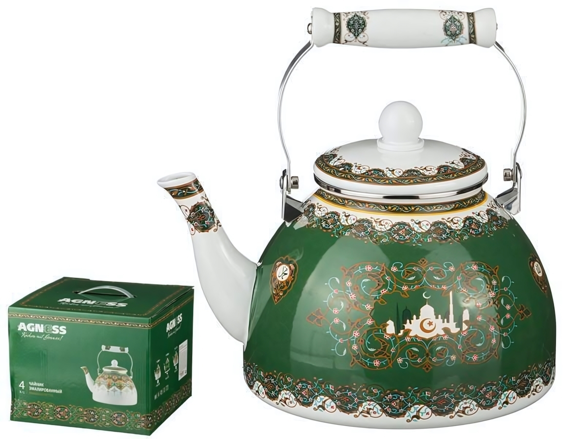 Чайник имеет объем 4 литра, что идеально подходит для больших заварок. Эмалированное покрытие гарантирует, что он прослужит вам долго, сохраняя при этом свой первоначальный вид. Этот чайник станет отличным выбором как для ежедневного использования, так и для особых случаев.