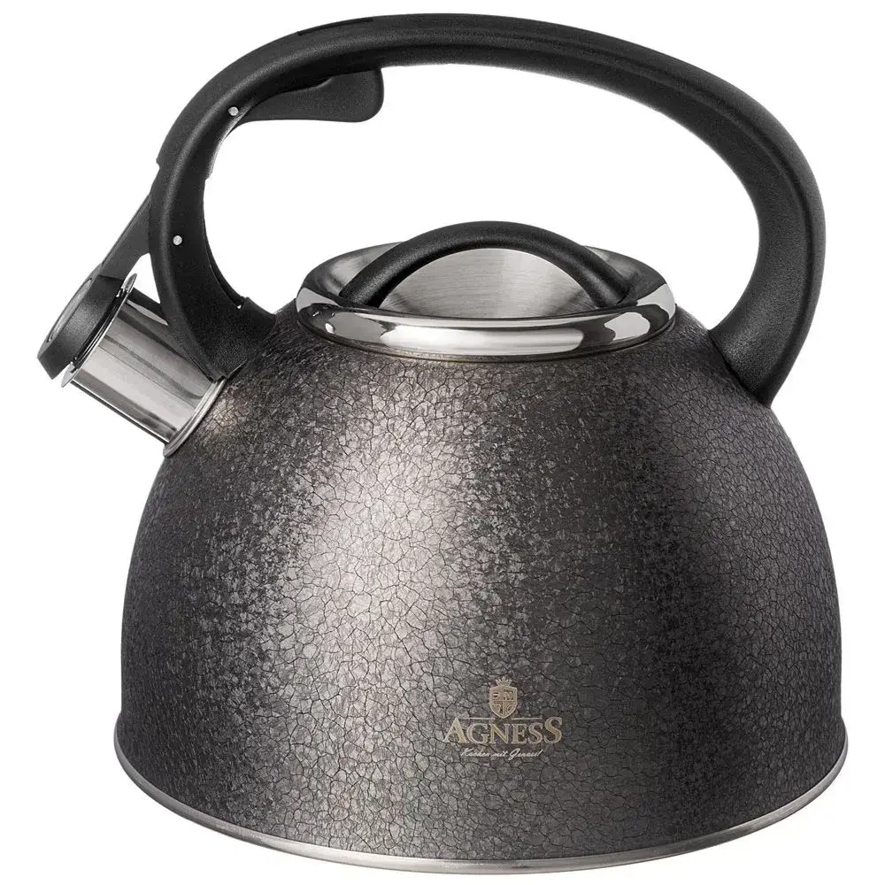Чайник Agness со свистком 2,5 л, серый, индукционное дно, металлический корпус, пластиковая ручка