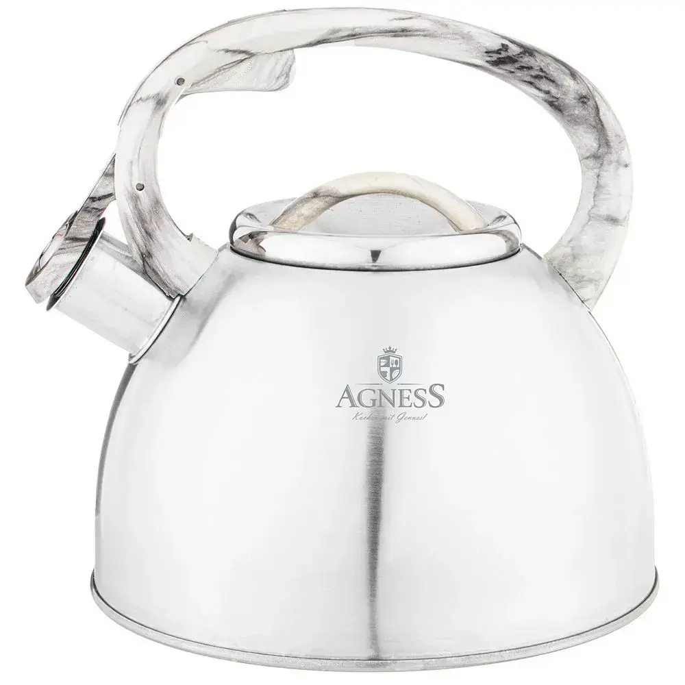 Чайник со свистком Agness 2,5 л, индукционное дно, серебристый корпус, ручка под мрамор