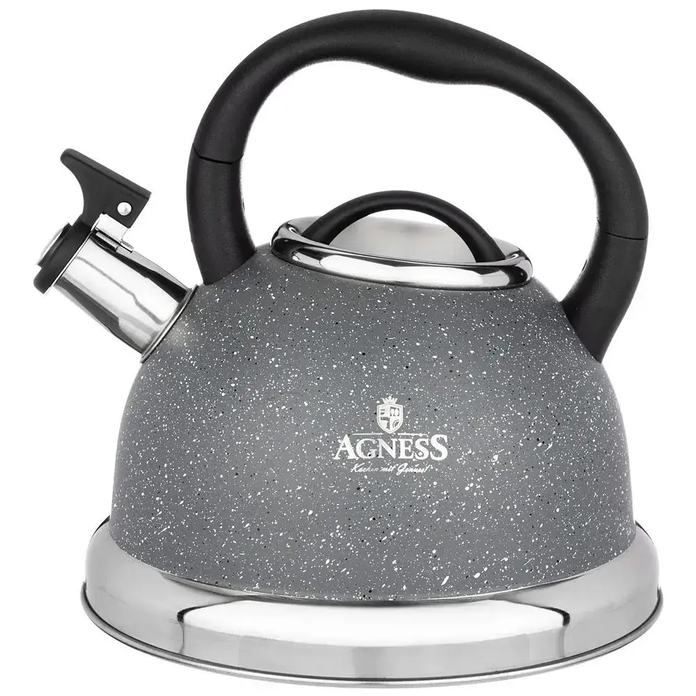 Металлический чайник Agness сочетает в себе функциональность и стильный современный внешний вид. Удобная складная ручка и громкий свисток сделают процесс приготовления чая максимально комфортным, а фактурная поверхность «каменная крошка» добавит эстетики вашей кухне.
