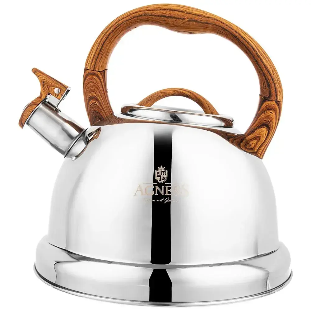 Металлический чайник Agness со свистком станет надежным помощником в приготовлении чая или кофе. Эргономичная складная ручка из натурального дерева обеспечивает безопасный перенос, а громкий сигнал оповестит о закипании воды.