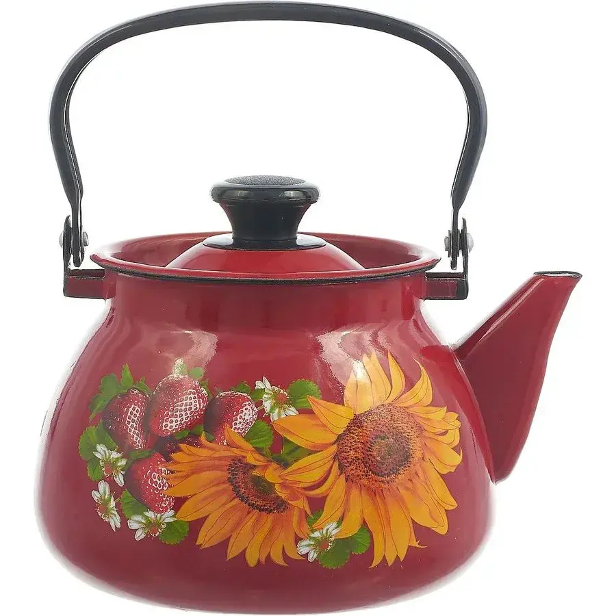 Чайник эмалированный 3,0л, красный с рисунком подсолнухов и клубники, подвижная ручка