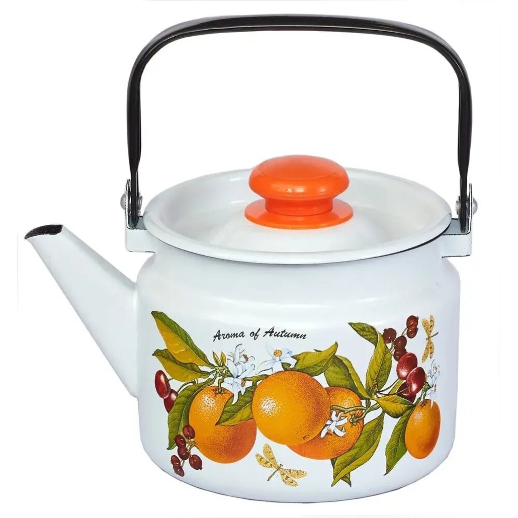 Превосходный чайник объёмом 2,0 литра изготовлен из эмалированного металла и отлично подходит для домашнего использования. Его яркий дизайн с изображением ветки апельсина и природными элементами создаст уютную атмосферу во время чаепития и радует глаз.