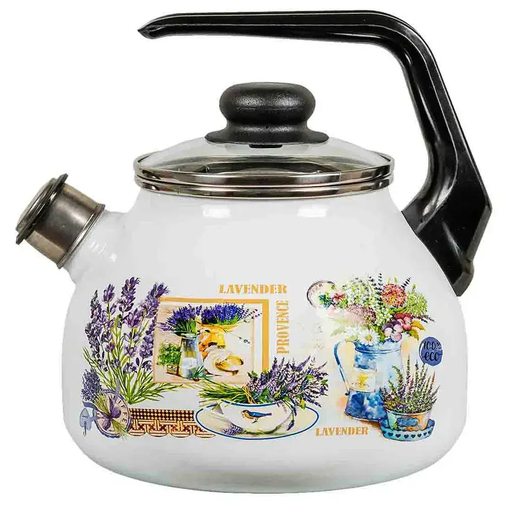Прекрасный дизайн с изображением лаванды и природных мотивов делает его не только функциональным, но и стильным дополнением кухни. Крышка стеклянная с металлической окантовкой, носик с механизмом для подачи воды, черная пластиковая ручка — все рассчитано на комфорт использования.