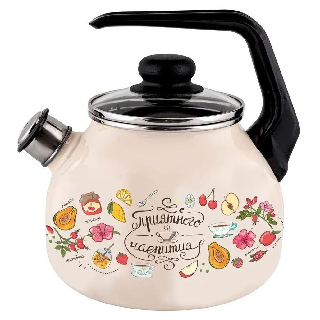 Чайник эмалированный 3л со свистком, дизайн "Приятного чаепития", металлический
