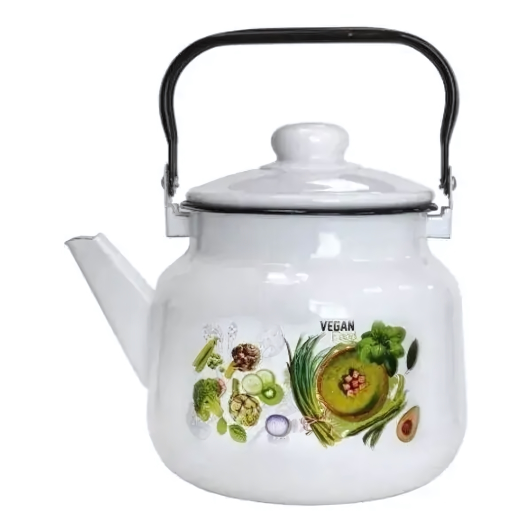 Преимущества: выполнен из высококачественной эмали, устойчива к коррозии и царапинам, обладает удобной дугообразной ручкой и округлой крышкой для комфортного использования. Яркий рисунок овощей и зелени создает приятную атмосферу на кухне.