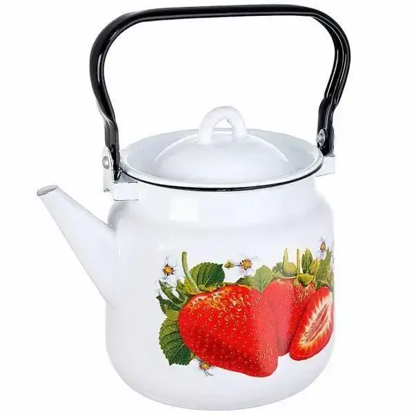 Создайте атмосферу летнего сада с чайником, украшенным сочными ягодами клубники и зелеными листьями. Практичная эмалированная поверхность сочетает эстетику и функциональность для ежедневного использования.
