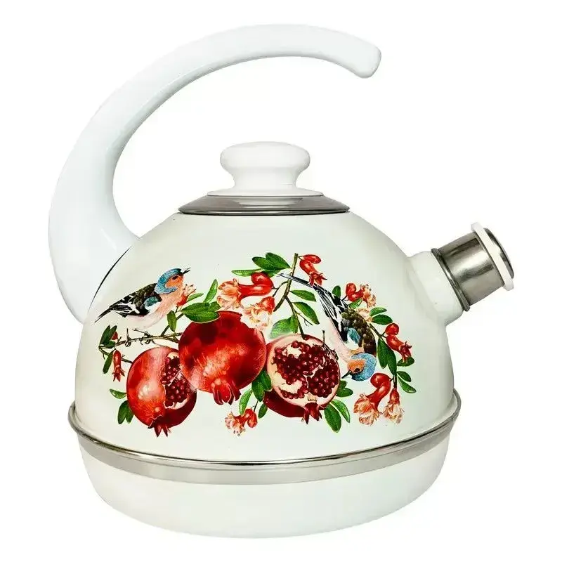 Чайник эмалированный 3,5л с конусным носиком и ручкой, белый с гранатовым декором