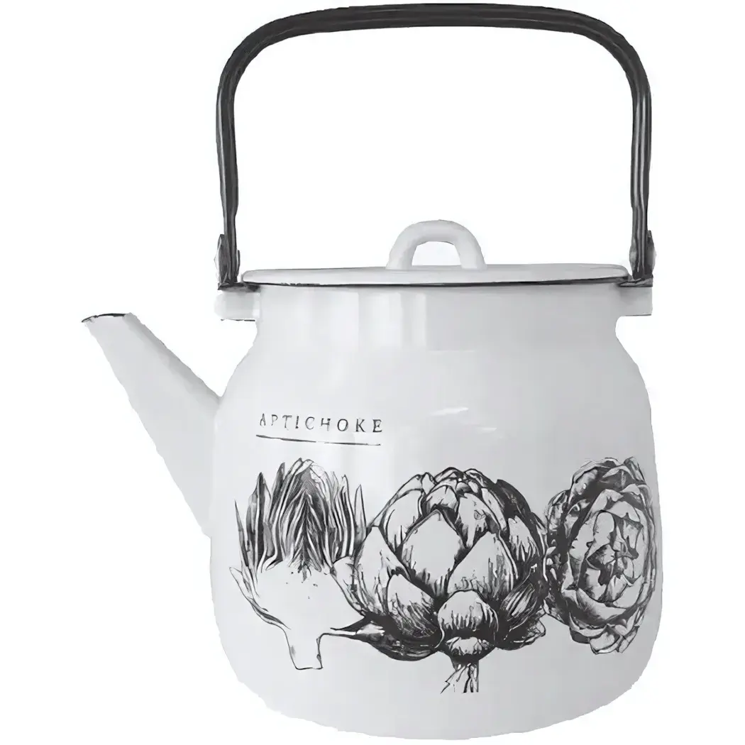 Эмалированный чайник «Artichoke» объемом 3,5 литра — это идеальное решение для тех, кто ценит комфорт и стиль на кухне. Его классический дизайн с черно-белыми рисунками артишоков не только украсит ваш интерьер, но и станет надежным помощником в приготовлении чая и других горячих напитков.