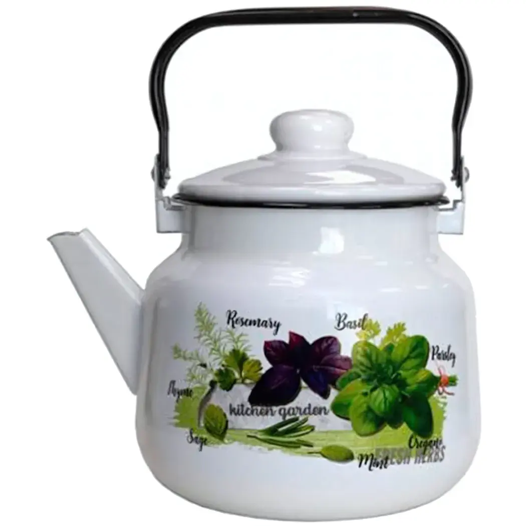 Эмалированный чайник объёмом 3,5 л с авторским дизайном станет практичным дополнением вашего быта. Яркий рисунок с душистыми травами создаёт атмосферу домашнего тепла, а продуманная конструкция обеспечивает комфорт в использовании каждый день.