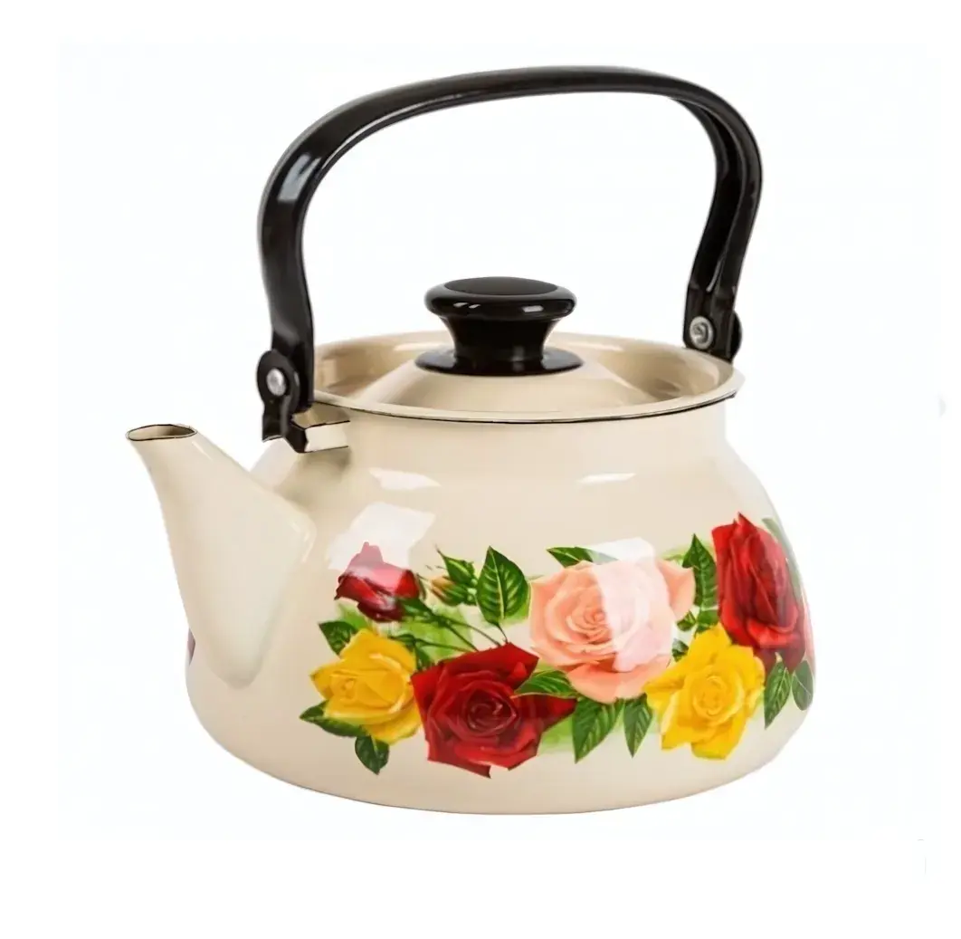 Чайник эмалированный 3л, цвет слоновый/белый с розами, для плит