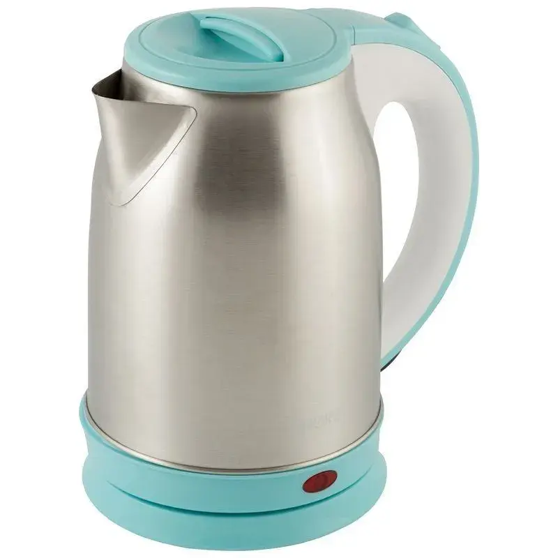Голубое пластиковое основание и бело-стальной корпус создают гармоничный внешний вид. Закрытый нагревательный элемент предотвращает образование накипи, а съемная крышка с фильтром обеспечивает легкую очистку. Специальная площадка с поворотным механизмом на 360° позволяет удобно размещать чайник на столешнице.