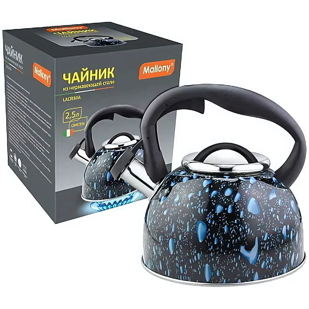 Чайник Mallony серии «Lacrima» сочетает элегантный дизайн и функциональность. Глянцевый корпус с эффектом синих капель на черном фоне станет изюминкой вашей кухни, а громкий свисток сообщит о закипании воды без лишних усилий.