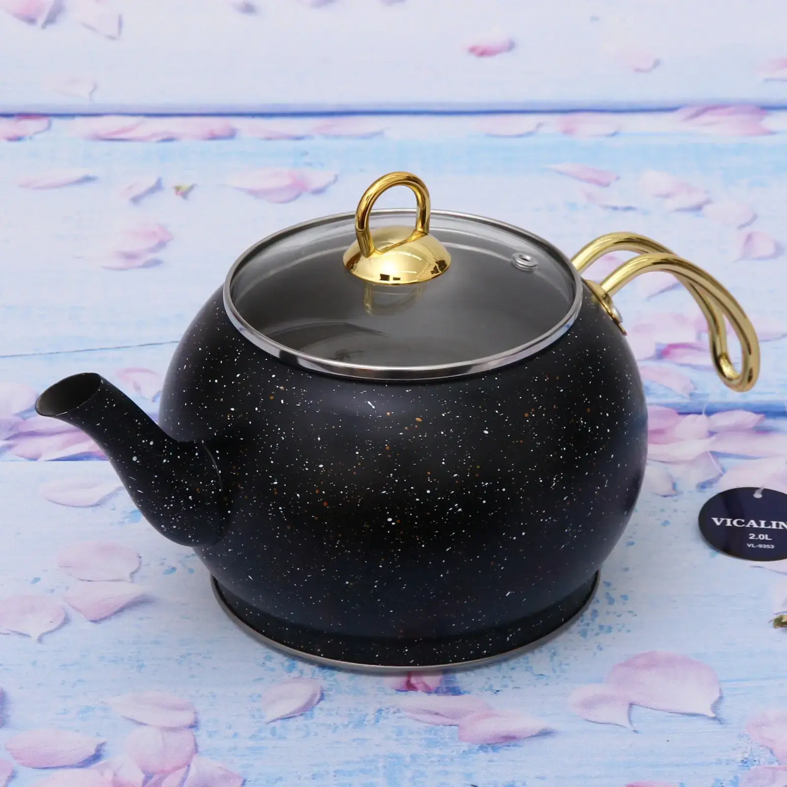 Чайник оснащен прозрачной крышкой с золотистой ручкой, что позволяет контролировать процесс кипячения. Эргономичная форма ручки обеспечивает удобство при наливании, а длинный носик позволяет точно направлять поток воды. Этот чайник идеально подходит для приготовления чая, кофе или других горячих напитков. Он станет отличным выбором как для домашнего использования, так и для подарка близким.