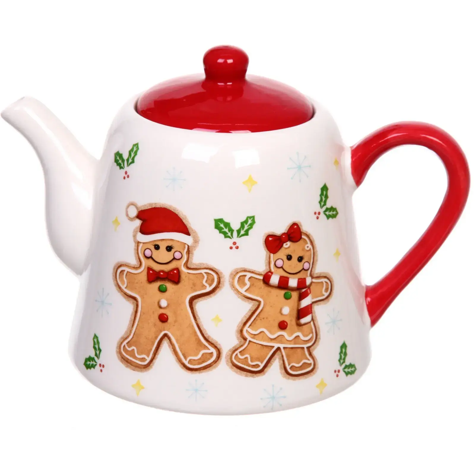 Чайник выполнен в белом цвете с красной крышкой и ручкой, а его декор включает изображения пряничных человечков, снежинок и зелёных веточек. Размеры чайника стандартные, что делает его удобным для хранения и использования. Этот чайник станет отличным подарком для любителей чая и тех, кто ценит уют в доме.