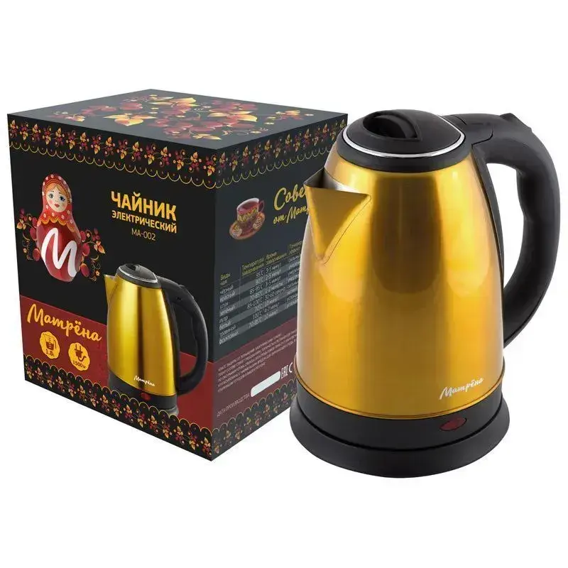 Электрический чайник 'МАТРЁНА MA-002' сочетает стильный дизайн и практичность. Его объем 1,8 литра идеально подходит для приготовления горячей воды как для одной чашки чая, так и для всей семьи.
