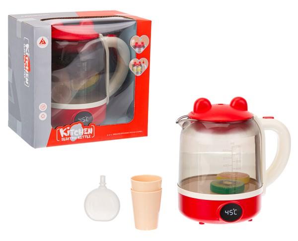 Чайник предназначен для детей и идеально подходит для игры в «кухню». Он работает на батарейках, что делает его безопасным и удобным в использовании. В комплект входят два пластиковых стакана, которые позволят вашему ребенку наливать «чай» и угощать друзей. Чайник имеет прозрачный корпус, что позволяет наблюдать за процессом кипячения.