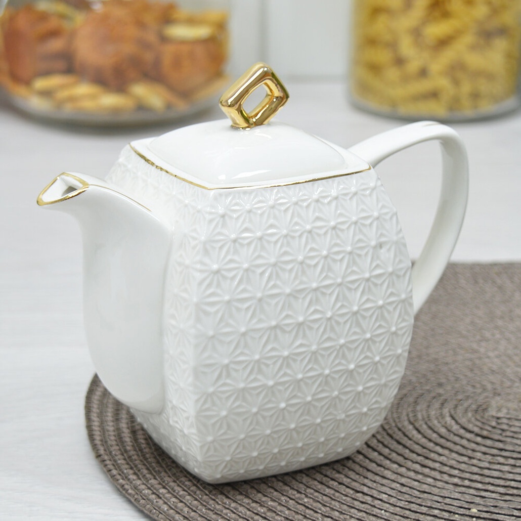 Погрузитесь в мир утонченного чаепития с заварочным чайником 'Снежная королева'. Этот стильный чайник объемом 0,55 литра выполнен из высококачественного фарфора и станет не только функциональным, но и эстетичным дополнением вашей кухни. Его квадратная форма с плавными углами и белоснежный цвет, украшенный золотыми элементами, придают ему изысканный вид, который украсит любой стол.