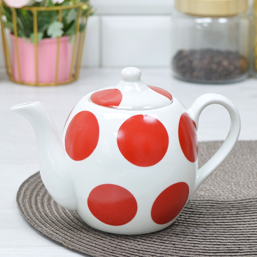 Чайник имеет округлую форму и белый цвет с крупными красными круглыми точками, что делает его уникальным и запоминающимся. Его размеры позволяют удобно хранить его на полке или столе. Упаковка выполнена в ярком фиолетовом цвете, что делает его отличным подарком для любителей чая.