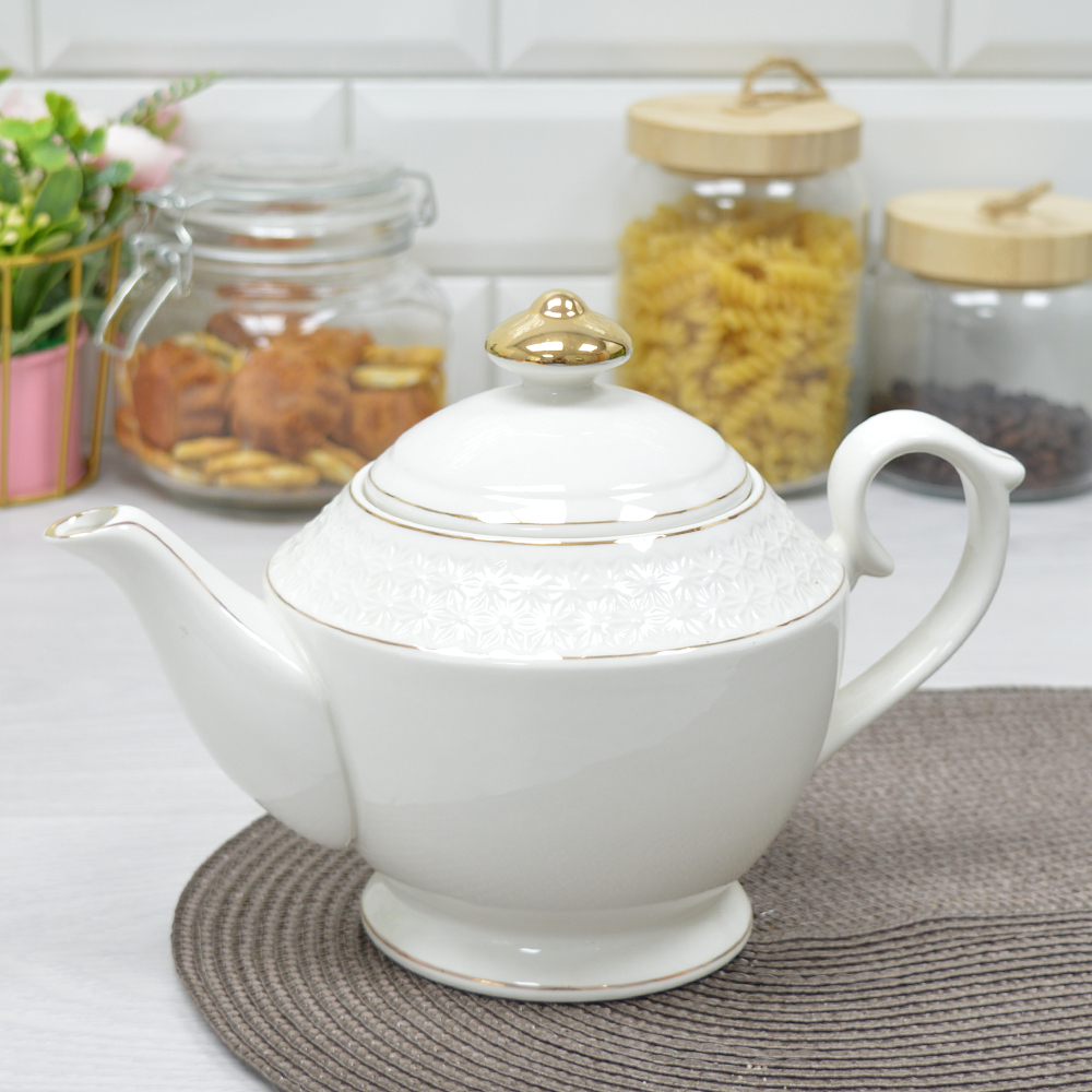 Объём 1,1 литра оптимален для компании до 4 человек. Изготовлен из белого фарфора, украшен золотистыми элементами по контуру и на крышке, аксессуар гармонирует как с классическим, так и с современным интерьером кухни или гостиной.