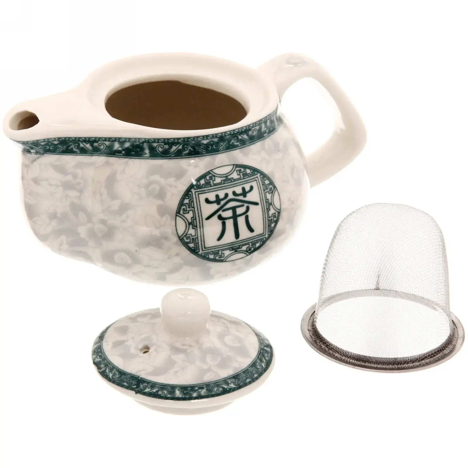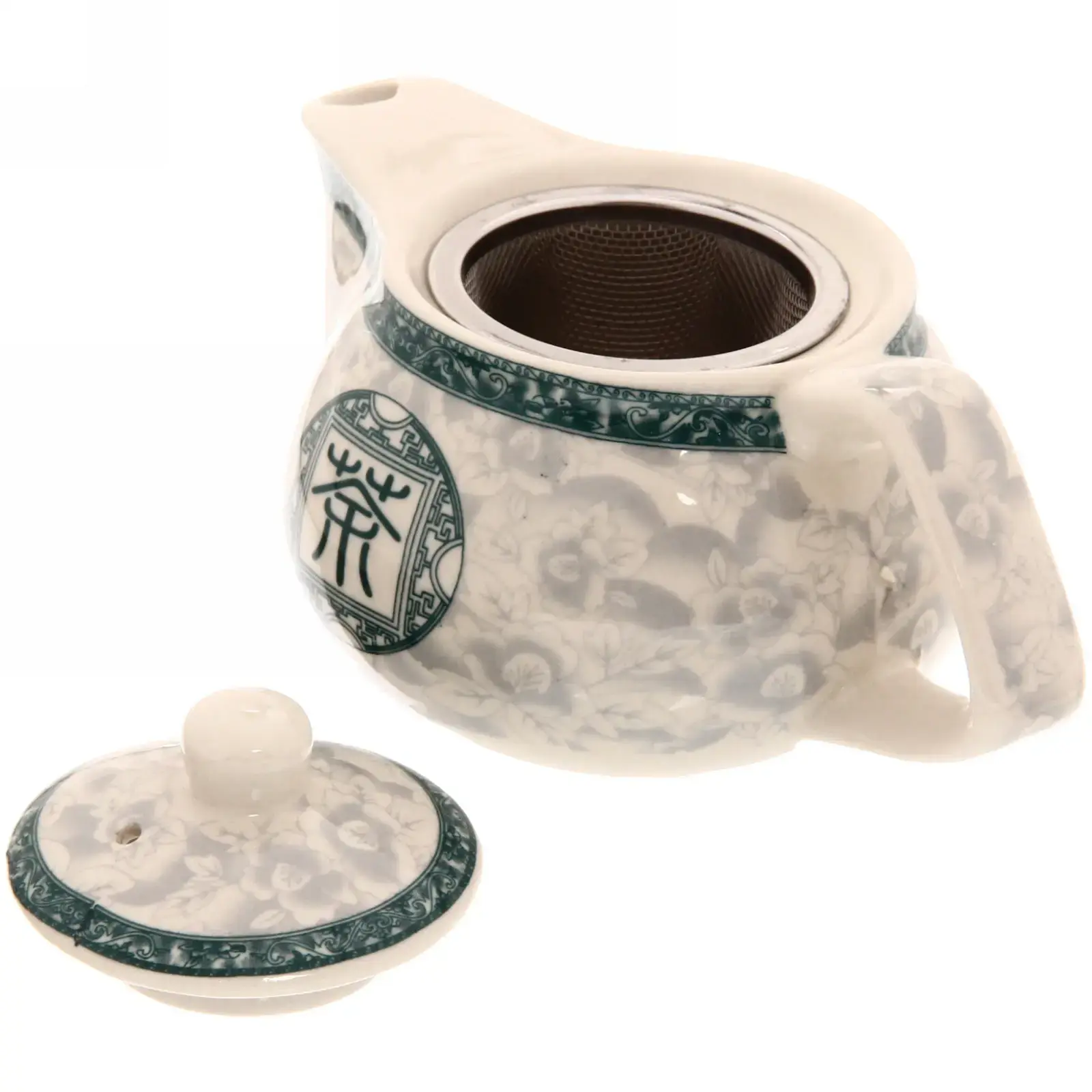 Чайник заварочный керамический 200 мл с ситом, белый с зеленым орнаментом, металлический фильтр