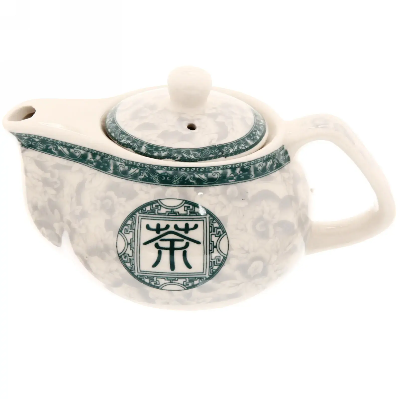 Белоснежная глазурь с зеленым орнаментом и традиционным иероглифом «чай» создает атмосферу восточной чайной церемонии. Округлая форма способствует равномерному прогреву заварки, а удлиненный носик обеспечивает аккуратное наливание без капель.