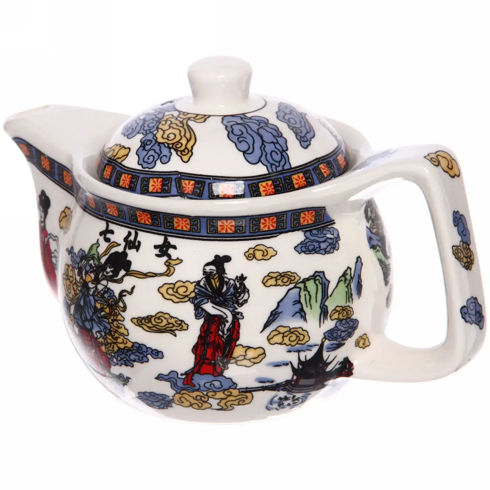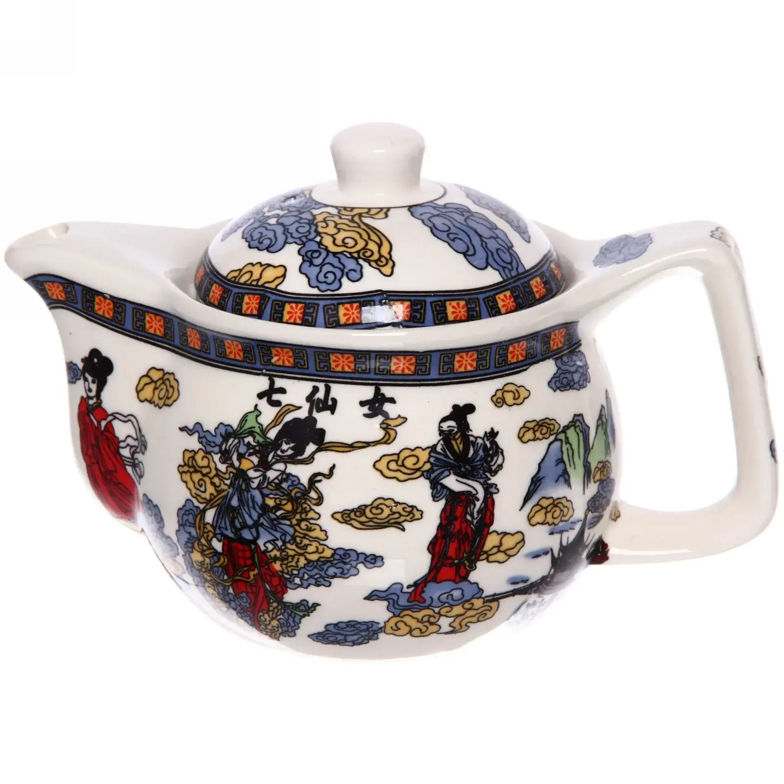 Чайник украшен традиционными восточными мотивами: изображениями людей в национальных костюмах на фоне гор и облаков. Сочетание белого фона с яркими акцентами синего, красного и золотого цветов создает элегантный и благородный образ.