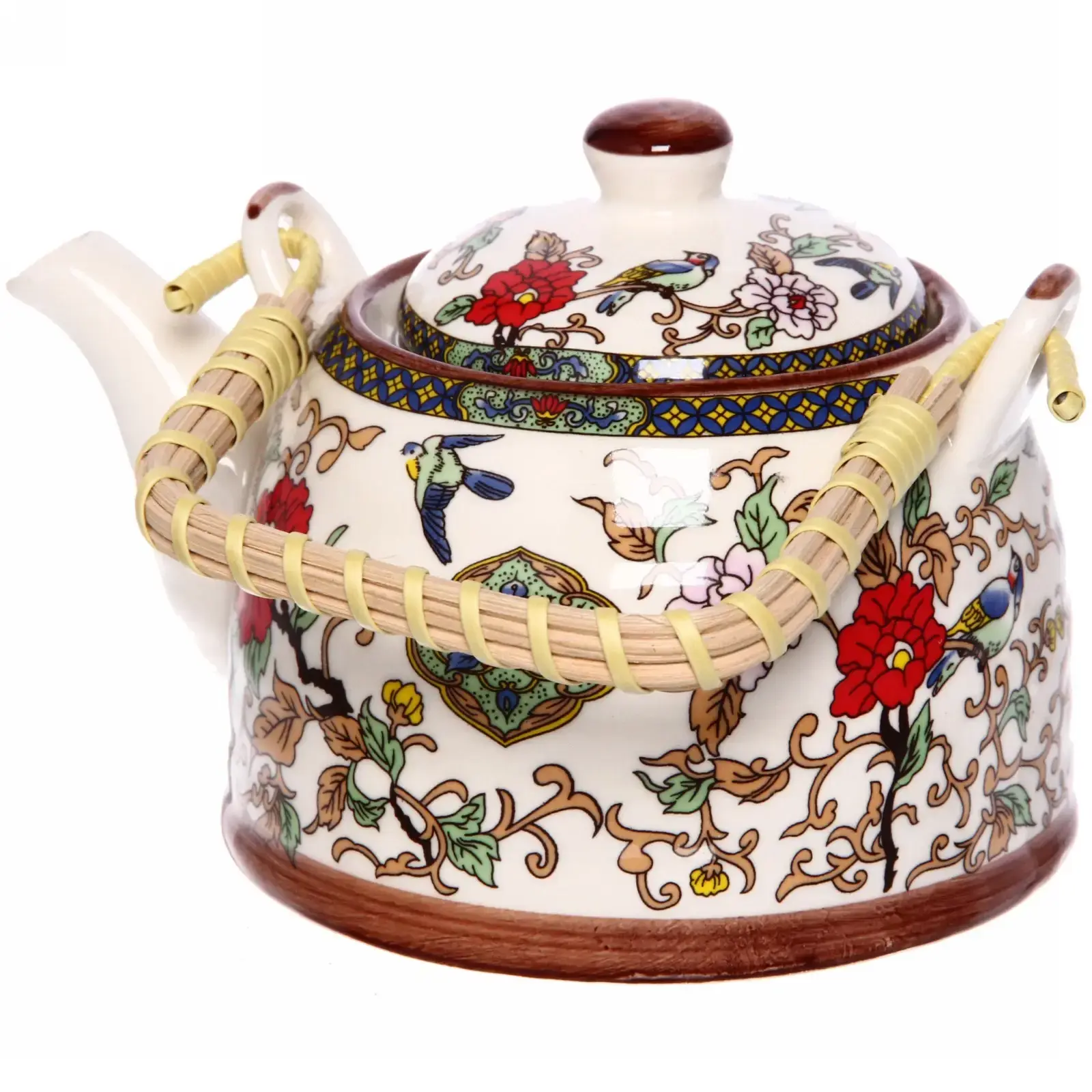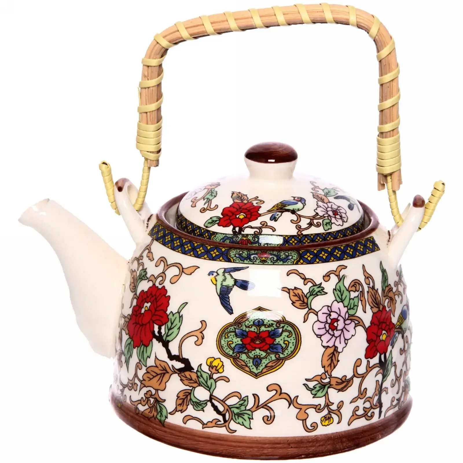 Чайник изготовлен из качественной керамики с металлическим фильтром и оснащен удобной плетёной ручкой. Оригинальный декор с изображением птиц и цветов создает особую атмосферу восточного очарования.
