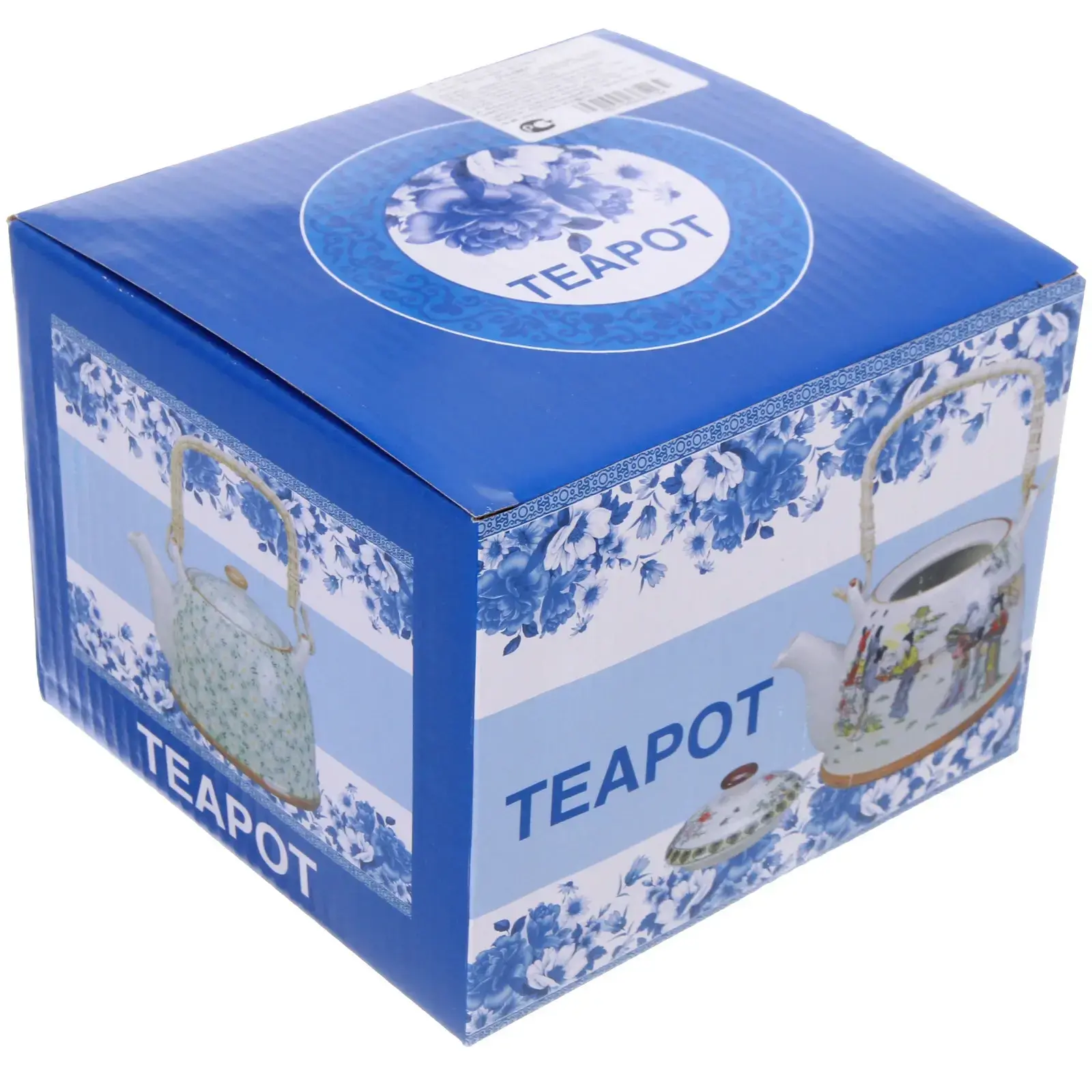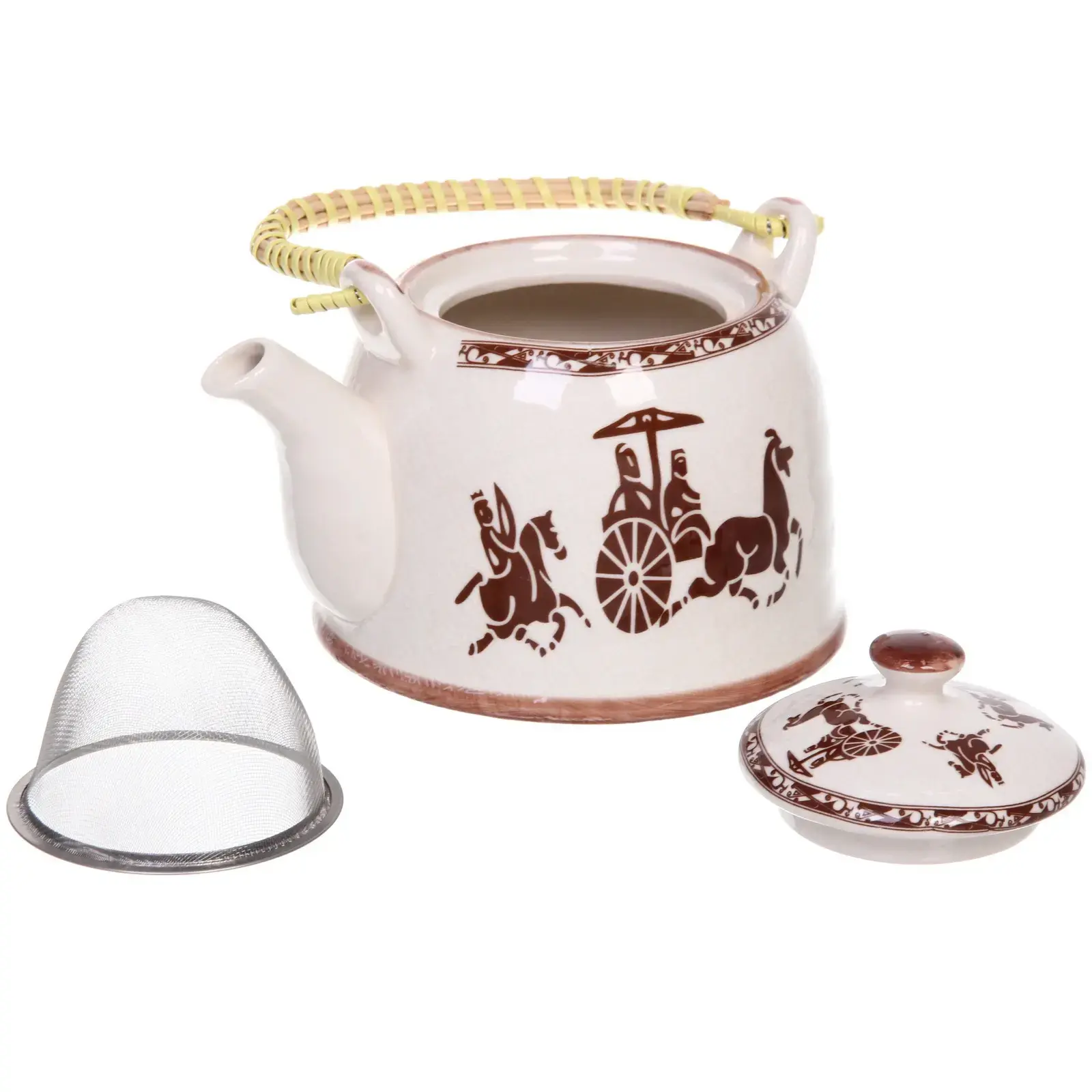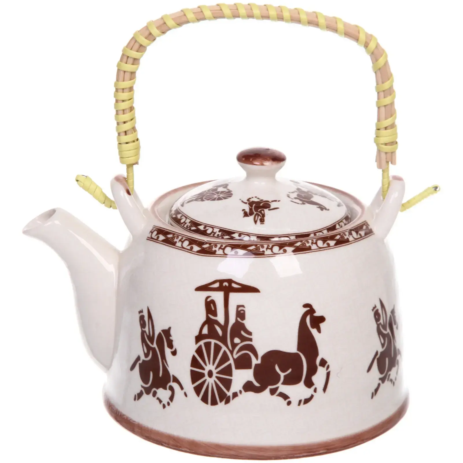 Чайник имеет округлую форму и стильный дизайн, который включает в себя коричневые узоры, изображающие всадников и колесницы. Его компактные размеры делают его удобным для хранения. Этот чайник станет отличным подарком для любителей чая и ценителей красивой посуды.