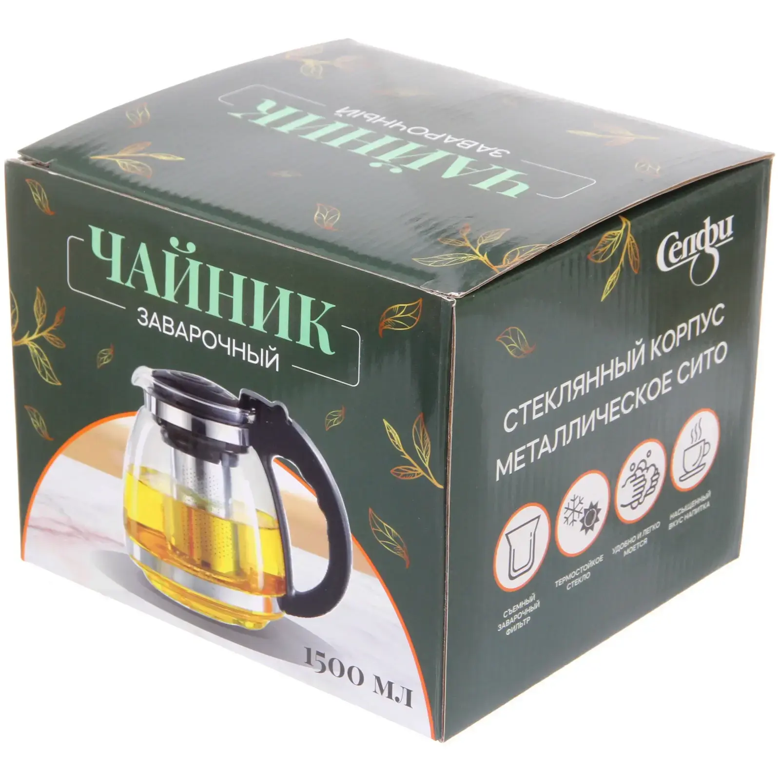 Объем чайника составляет 1500 мл, что позволяет заваривать достаточное количество чая для всей семьи или компании друзей. Его размеры и форма делают его удобным для хранения и использования. Чайник выполнен из качественных материалов: стекло, металл и пластик, что обеспечивает надежность и долговечность.